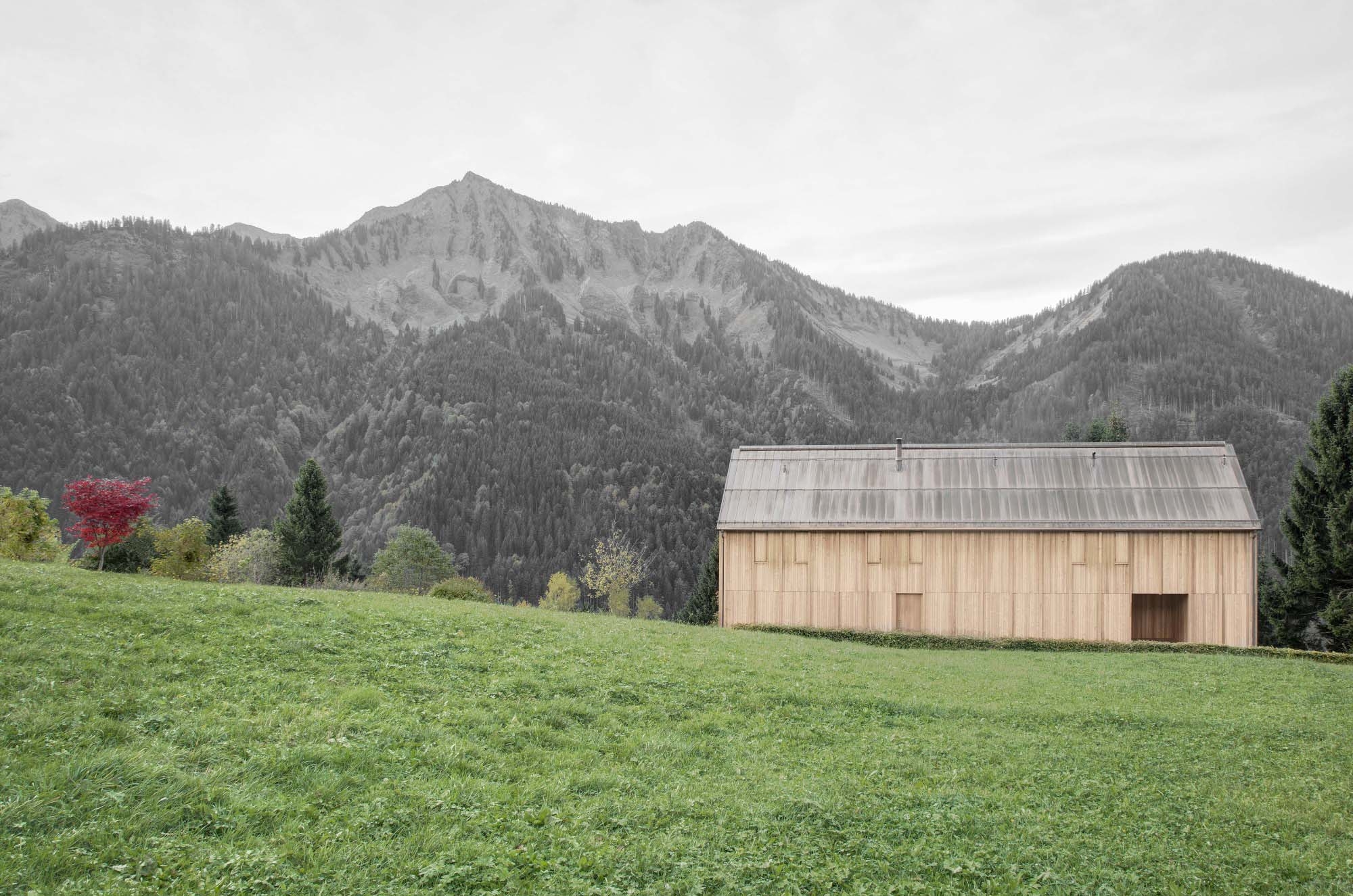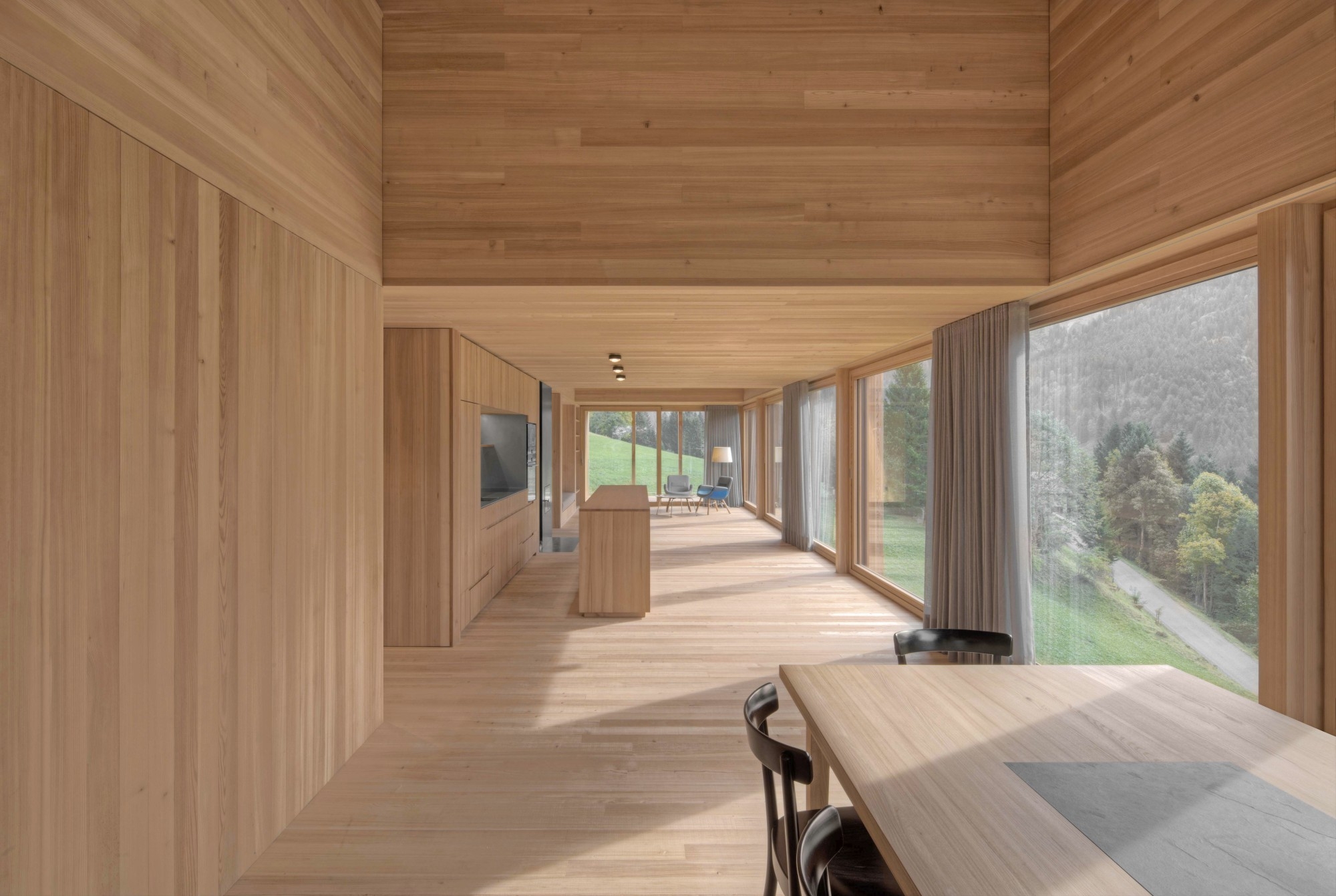 Holz: Der Einsatz der heimischen Lärche und deren differenzierte Oberflächenbehandlung von außen (sägerau) nach innen unterstreichen das solitäre Erscheinungsbild. Decken und Wände sind in Holzelementbau erstellt, das Dach erhält eine Blechdeckung.