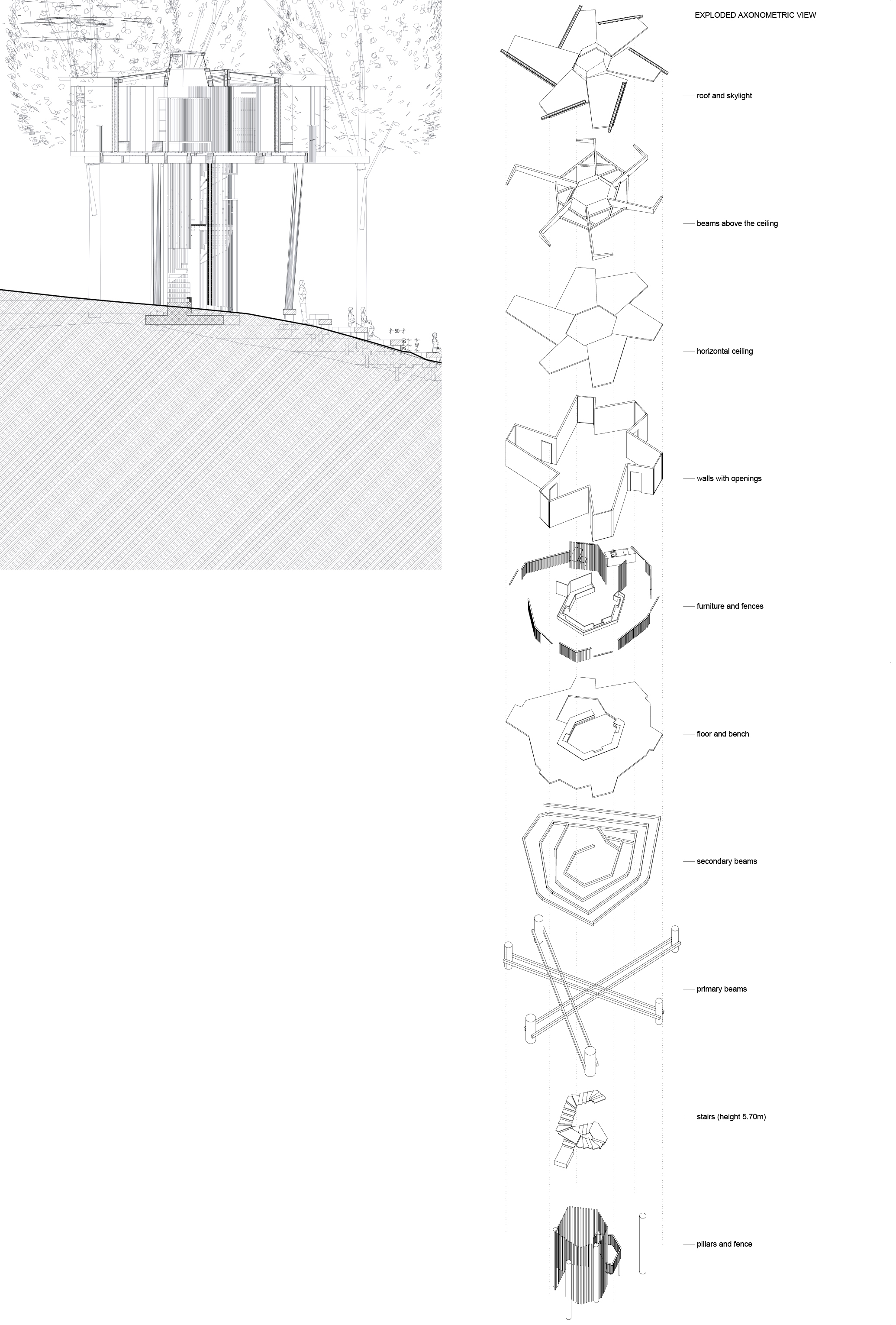 Entwurf: Im Stadtwald Celje wurde auf einer natürlichen Erhebung entlang eines Pfades ein Beobachtungsbaumhaus errichtet. Sechs Bäume und vier Stützen tragen die Last der Plattform, die über eine Wendeltreppe erreichbar ist. Das Baumhaus nimmt die Geometrie der benachbarten Bäume architektonisch auf und bildet sechs „Finger“ aus, deren Raumvolumen sich um einen natürlich belichteten Innenraum gruppieren. Ursprünglich als grünes Klassenzimmer gedacht, um Schulkindern das Ökosystem Wald näherzubringen, entwickelte sich das Baumhaus zusammen mit dem Freiluft-Amphitheater schnell zu einem beliebten Ort für Konzerte, Workshops und andere Veranstaltungen und wurde ein neues Wahrzeichen der Stadt.