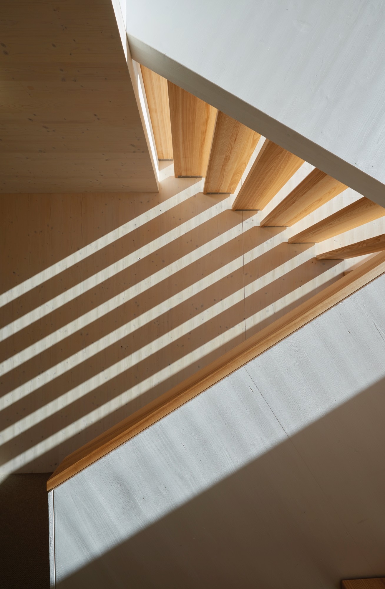 Holz: Der Neubau ist in Holztafelbauweise mit vorgefertigten Elementen errichtet. Die tragenden Wand- und Deckenelemente sowie Stützen zeigen im Innenraum ihre Fichtenholzoberfläche. Außen ist das Gebäude mit Weißtanne verschalt, die – der Vergrauung vorgreifend – lasiert