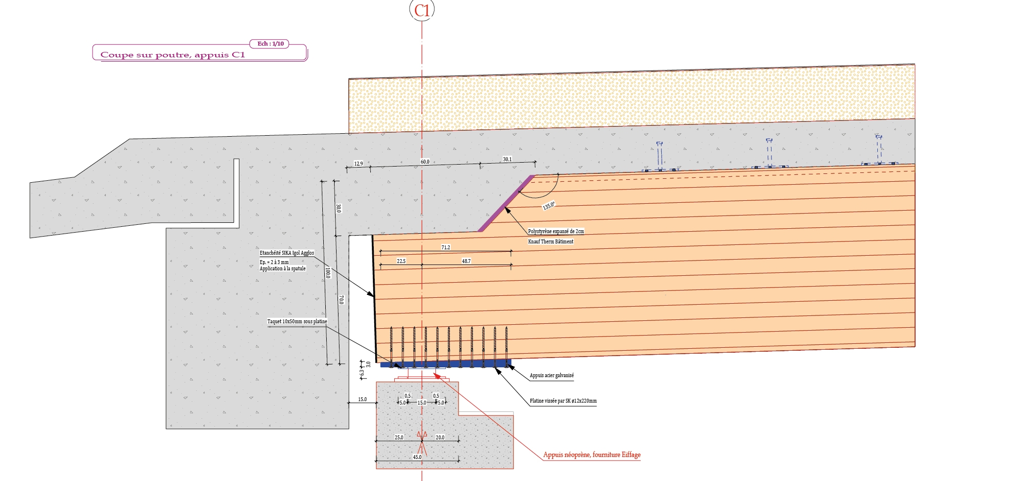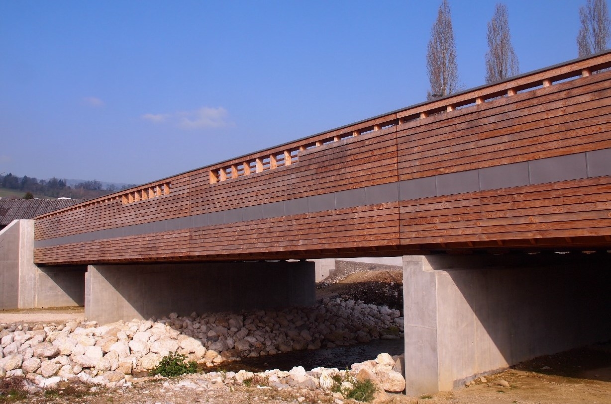 Entwurf: Die Cognin-Brücke ist die längste Straßenbrücke aus Holz in Frankreich. Das innovative Tragsystem, basierend auf Holzträgern in Verbindung mit einer Stahlbetondecke, ist in Frankreich einzigartig. Um das knorrige Holz der regional verfügbaren Douglasie verwenden zu können, musste für die 40 m langen Träger ein sehr großer Holzquerschnitt gewählt werden.