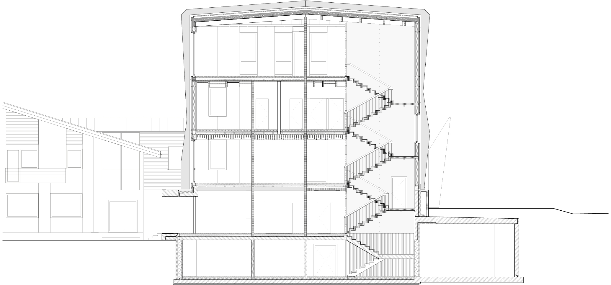 Holz: Der fünfgeschossige, hölzerne Monolith ruht auf einem schwarzen Betonfundament. Die Fassade aus undulierenden Lärchenholzlamellen spielt mit dem Gegensatz von Holz als leichtem beziehungsweise schwerem Material. Es werden bewusst verschiedenste Bauweisen vereint, von rauem Brettsperrholz in Industriequalität hin zu Ausführungen in Sicht- und Auslesequalität im Inneren. Massive Brettsperrholzträger und Holzrahmen stellen das Tragwerk, leichtere Holzrahmen und -tafeln die nichttragenden Wände.