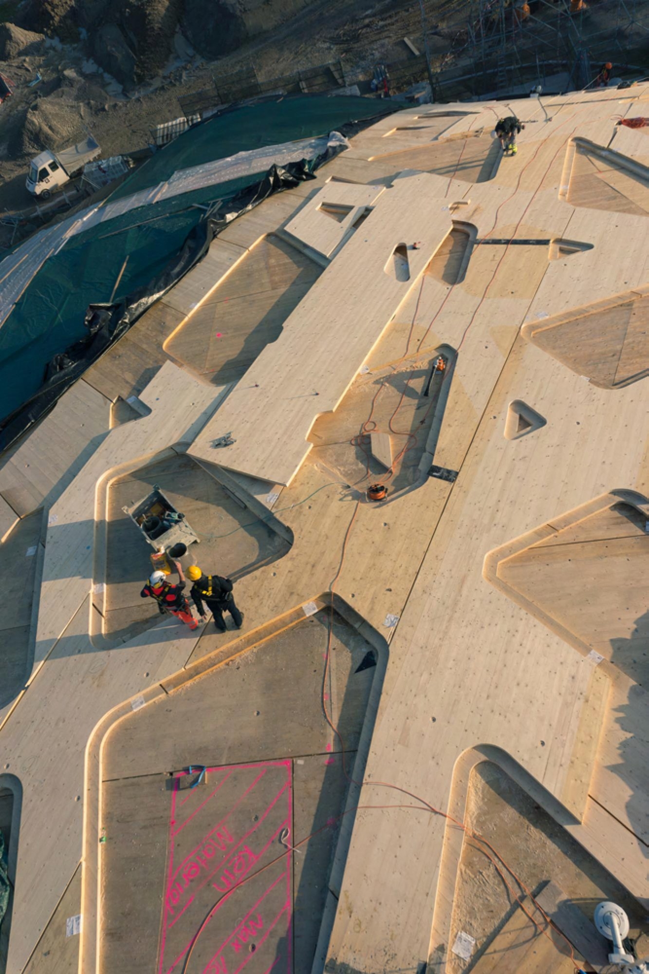 Holz: Das Dach ist als freitragende Holzschale aus vernagelten Brettsperrholzplatten ausgeführt. Die Platten der ersten Lage wurden über ein Lehrgerüst gebogen, die Platten der zweiten und dritten Lage um je 60° gedreht darüber vernagelt. Die dritte Lage verfügte bereits über die Ausschnitte der 271 Öffnungen, die später vor Ort in das Dach geschnitten wurden. Über dem Tragwerk liegen Installationsleitungen, Dämmung und Abdichtung. Den Abschluss des Dachaufbaus bilden aufgeständerte Furnierschichtplatten, die dem Elefantenhaus durch die witterungsbedingte Versilberung sein charakteristisches Erscheinungsbild verleihen. Die Öffnungen sind mit ETFE-Kissen eingedeckt, durch sie dringt Sonnenlicht ein, ohne dass die für das Pflanzenwachstum wichtigen UV-Komponenten herausgefiltert werden.