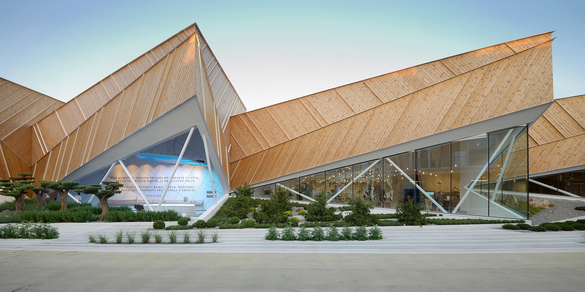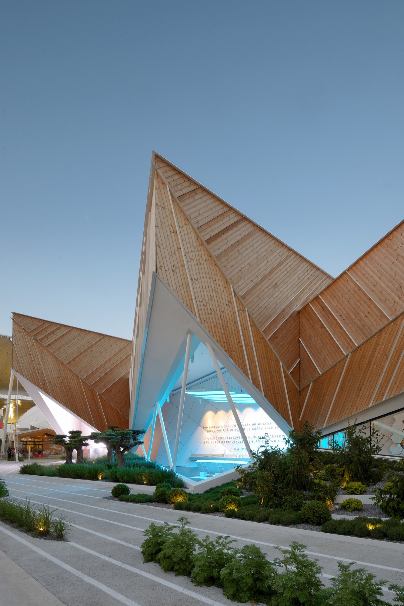 Entwurf: Für Slowenien war es von großer Wichtigkeit, sich auf der EXPO 2015 in Italien – dem drittgrößten Investor, zweitwichtigsten Handelspartner und wichtigsten Quellland von Touristen – mit einem besonderen Pavillon angemessen zu präsentieren. Die Wahl fiel auf eine ebenso komplexe wie dynamische Holzkonstruktion, in ihrer kantigen Form eine Anlehnung an die slowenische Berglandschaft, in der Fassaden- und Außengestaltung dagegen an bestellte Felder oder eine Blattoberfläche erinnernd.