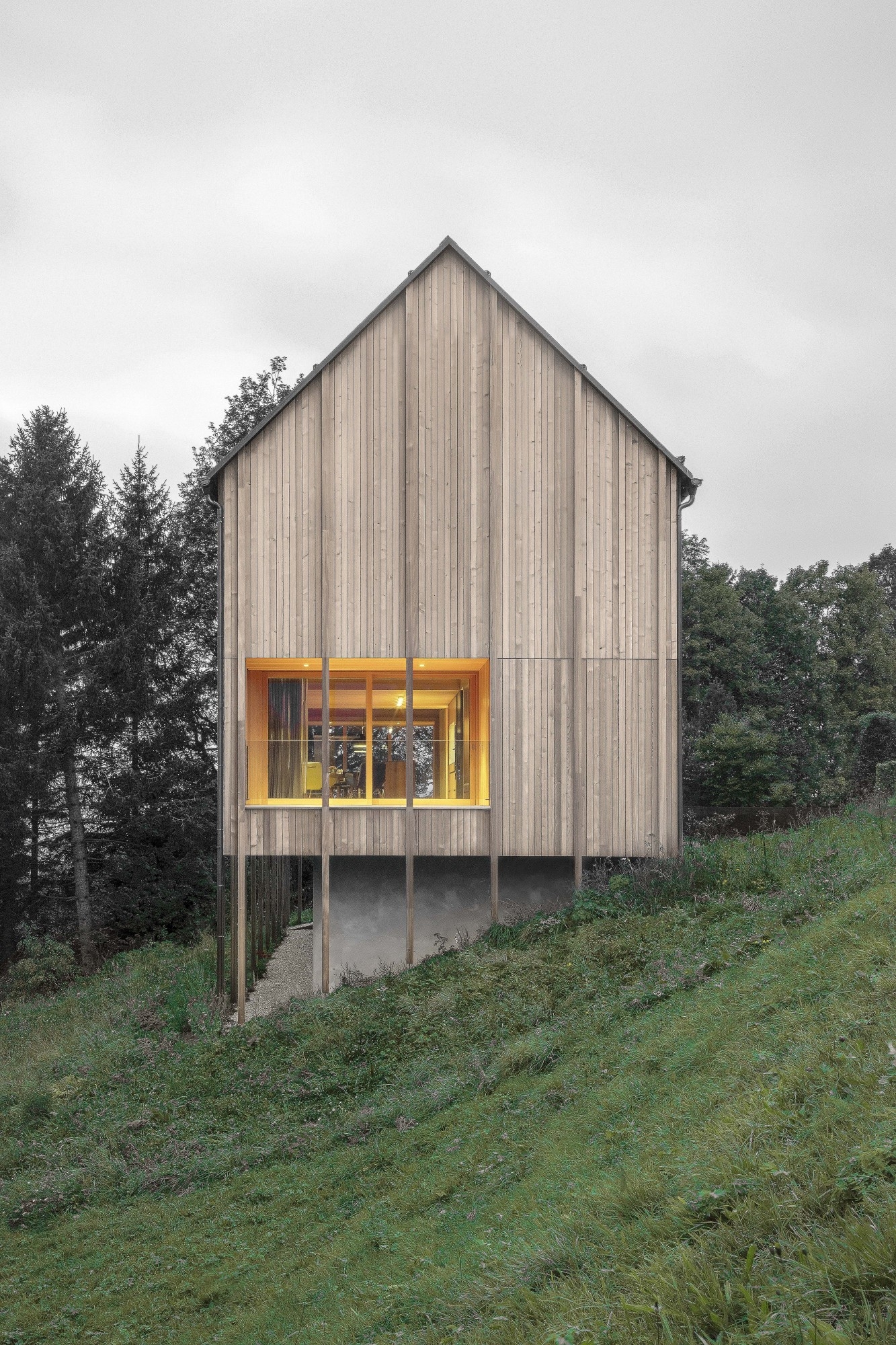 Entwurf: Im 1000 Meter über Meer gelegenen Weiler Stürcher Wald steht das Haus in sehr steil geneigter Südhanglage. Der Baukörper orientiert sich in seinem Erscheinungsbild einerseits an der traditionellen Bautypologie des Walserhauses (Blockhaus). Andererseits bricht der schlichte Längsbaukörper mit Satteldach und strukturierter Holzfassade aber bewusst mit dem traditionellen Vorbild und zeigt, dass er von heute ist. Die Räume werden auf zwei Geschossen organisiert. Die gesamten Funktionen des täglichen Lebens mit Essen und Wohnen befinden sich auf Ankunftsniveau. Die privaten Räume (Schlafzimmer und Bad) befinden sich noch etwas feiner und subtiler gearbeitet im Geschoss darüber. Der sehr schmale Zuschnitt und die strenge Organisation des Grundrisses ermöglichen eine maximale Ausnützung der Besonnung des Hauptgeschosses, was speziell in den Wintermonaten das Leben in den Bergen mit einem erheblichen Mehrwert ausstattet.https: