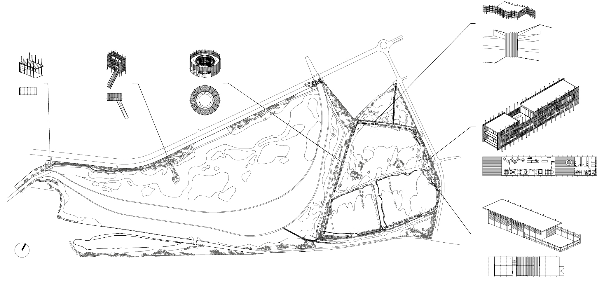 Entwurf: Das Naturreservat Škocjan ist eine wertvolle Brackwasserlagune der Adria, die – zwischen Verkehrsachsen und der Stadt Koper – vielen Huftieren und über 245 Vogelarten als Heimat dient. Die Interventionen sollen die Identität des Ortes erhalten und gleichzeitig architektonische Marken setzen. Überwiegend entlang eines Lehrpfads im östlichen Teil des Reservats sind 14 Bauten angeordnet, die insbesondere zur Naturbeobachtung dienen und Funktionen wie beispielsweise als Stallgebäude oder Beobachtungsplattform übernehmen. Das dreigeschossige Hauptgebäude bildet den Auftakt zum Rundweg und beherbergt ein Informationszentrum zum Naturschutzgebiet.