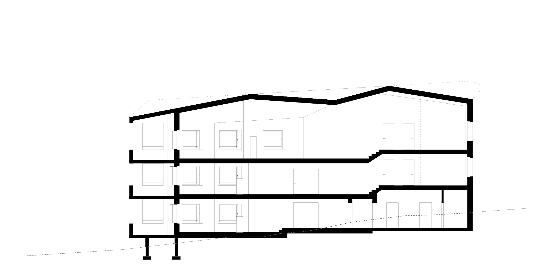 Entwurf: Das 3-geschossige Mehrfamilienhaus liegt in einer abfallenden Wiese im Dorfkern. Die Niveauentwicklung innerhalb der Wohnungen spiegelt den gewachsenen Geländeverlauf wieder. Die Schlafbereiche sind um einige Stufen abgesetzt, so ergibt sich eine natürliche Zonierung der Tag-Nacht-Bereiche. Der Holzbau orientiert sich in der Materialisierung an den bäuerlichen Ökonomiegebäuden der Umgebung.