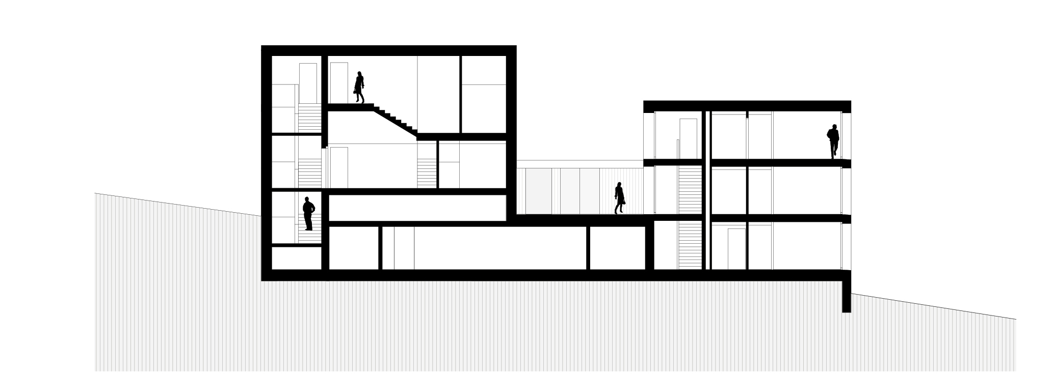 Das Wohngebäude ist eine Komposition aus drei Baukörpern in vorgefertigter Holzbauweise, die sich wie selbstverständlich in den Hang einfügt.