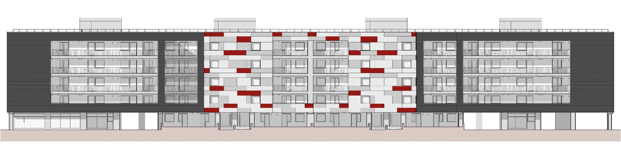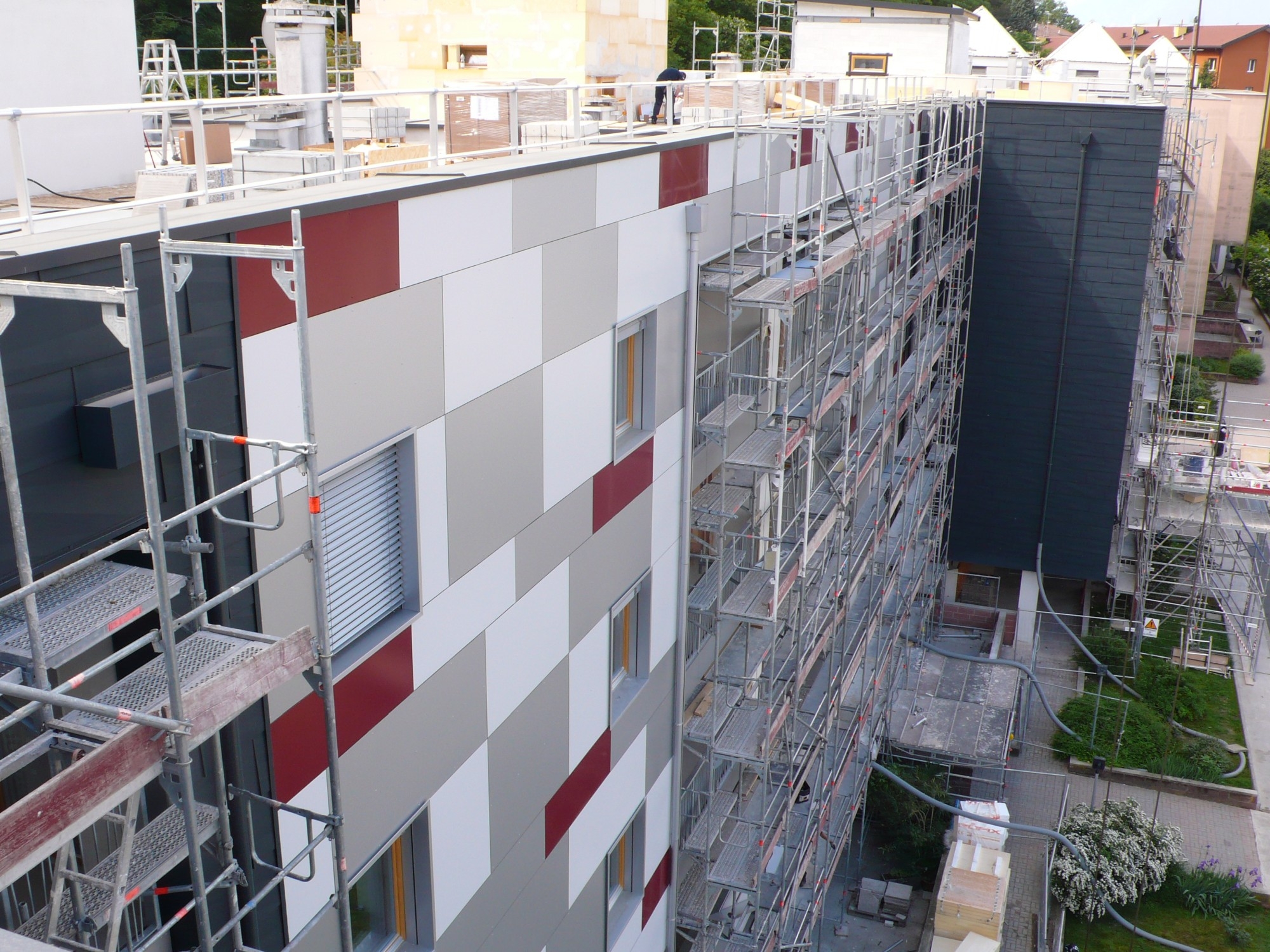 Umhüllung des Bestandsgebäudes (Stahlbeton und Mauerwerk) mit vorgefertigten Holzelementen
