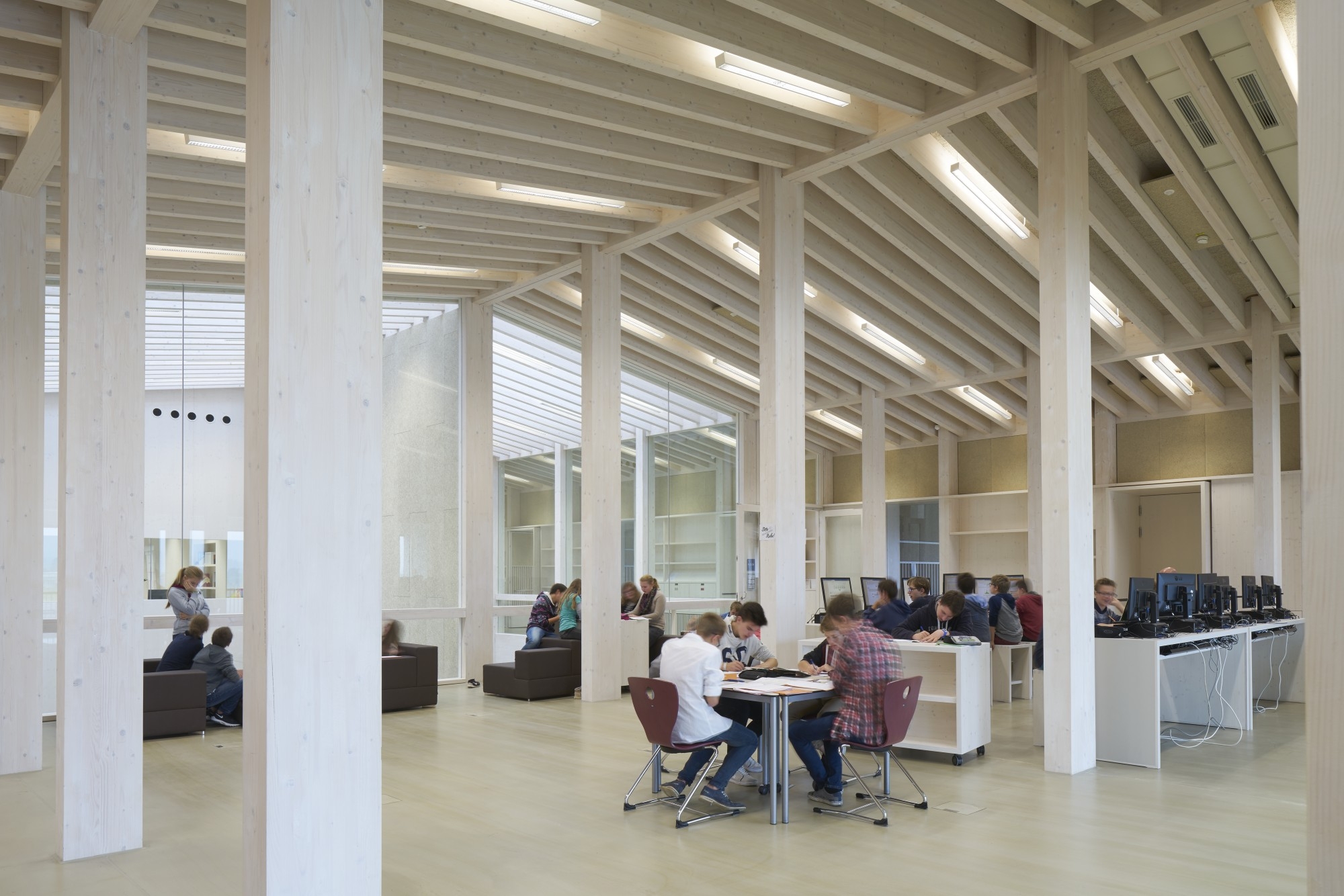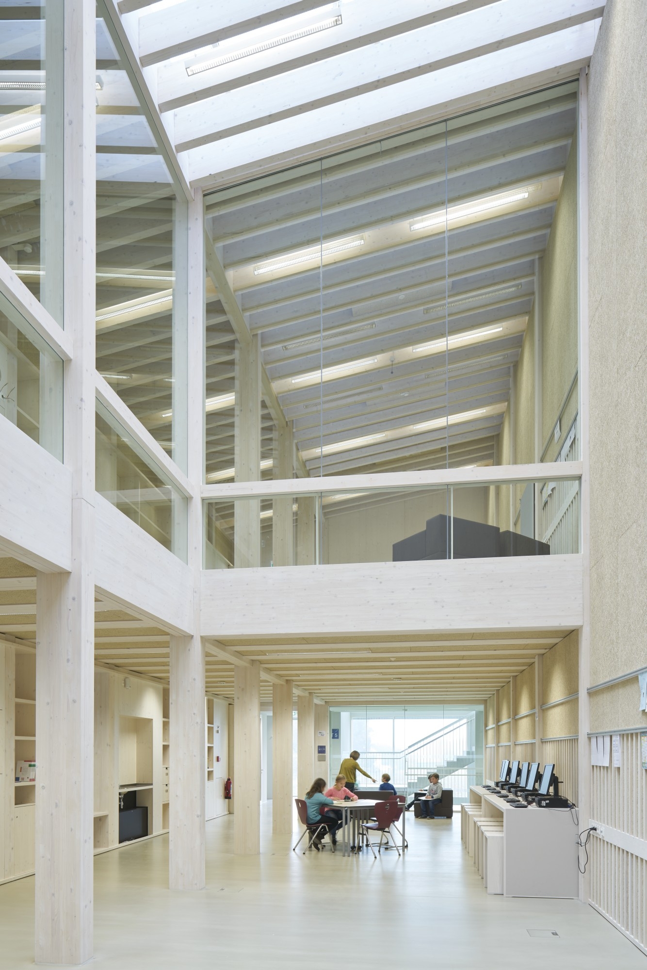 Energie: Als Plusenergiehaus erzeugt das Gymnasium mehr Energie, als sein Betrieb benötigt. Die Grundlage dafür bildet eine integrale Planung, die räumliche, statische und technische Aspekte kombiniert. Wie diese zusammenspielen, wird in einem Forschungsprojekt untersucht. Alle Baustoffe wurden vorab auf Schadstofffreiheit und Umweltfreundlichkeit geprüft.