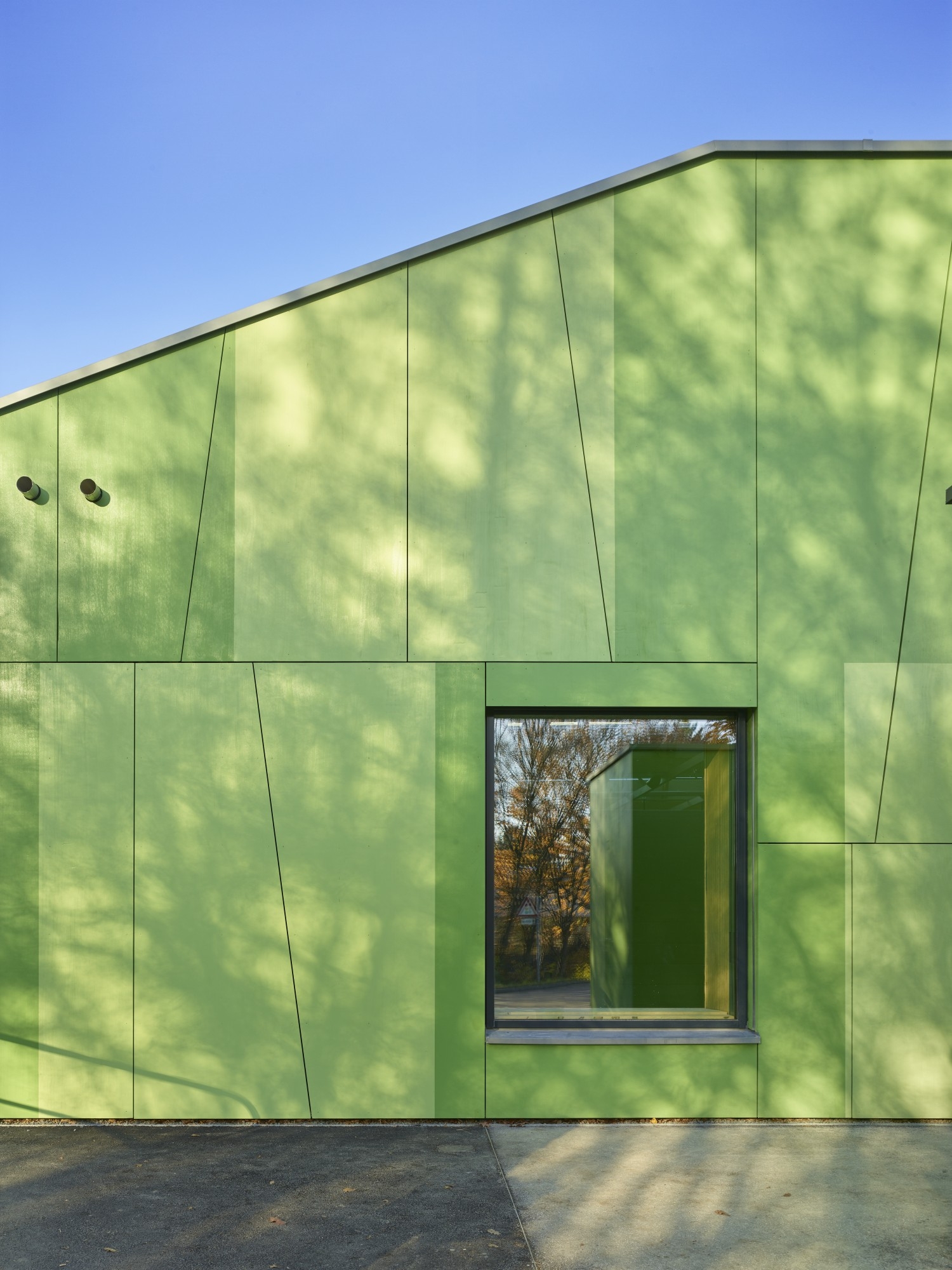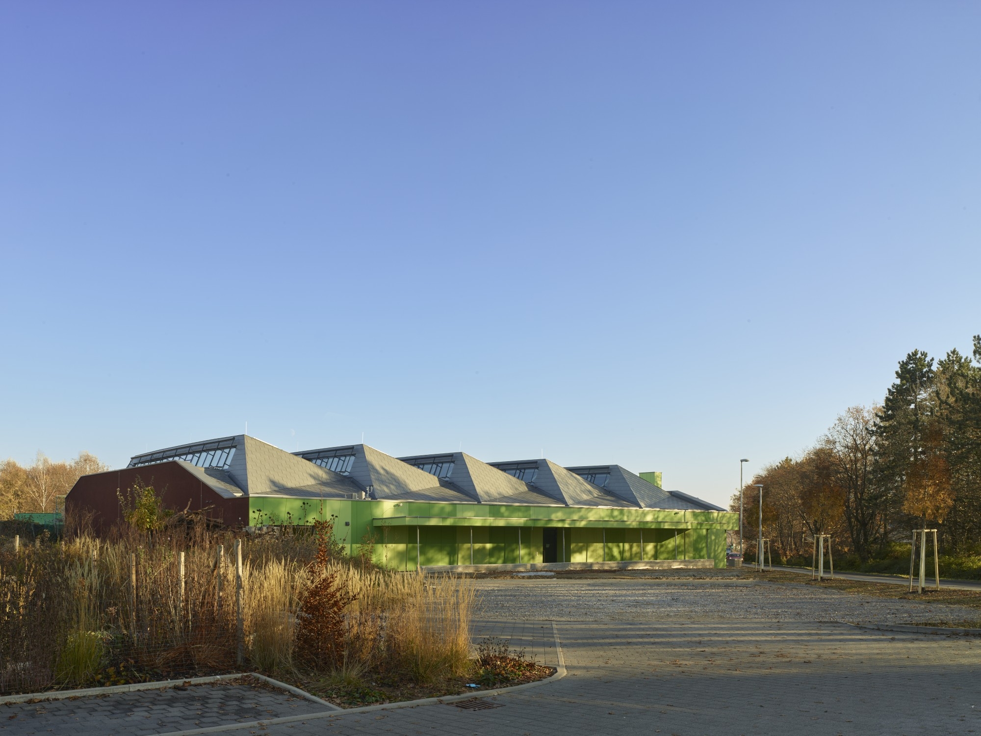 Holz: Der weitgespannte Fachwerkträger des Sheddachs besteht aus Baubuche, das gefaltete Dach ist als eine Rippendecke aus Holz mit raumseitiger, akustisch wirksamer Bekleidung konzipiert. Der Träger aus Baubuche ist in dieser Form einer der ersten seiner Art in Deutschland, die innovative Holzkonstruktion wurde als Forschungsprojekt von der EU gefördert. Die akustisch wirksamen Prallschutzwände sind ebenfalls aus Baubuche. Die äußere Gebäudehülle besteht aus einer hinterlüfteten Dreischichtplatte aus Nadelholz, modifiziert nach der Methode »Accoya«, in der Oberfläche gebürstet und mit einer diffusionsoffenen Dickschichtlasur farbig beschichtet. Sie gilt als besonders witterungsbeständig und wurde erstmals in dieser Art und Großflächigkeit verbaut.
