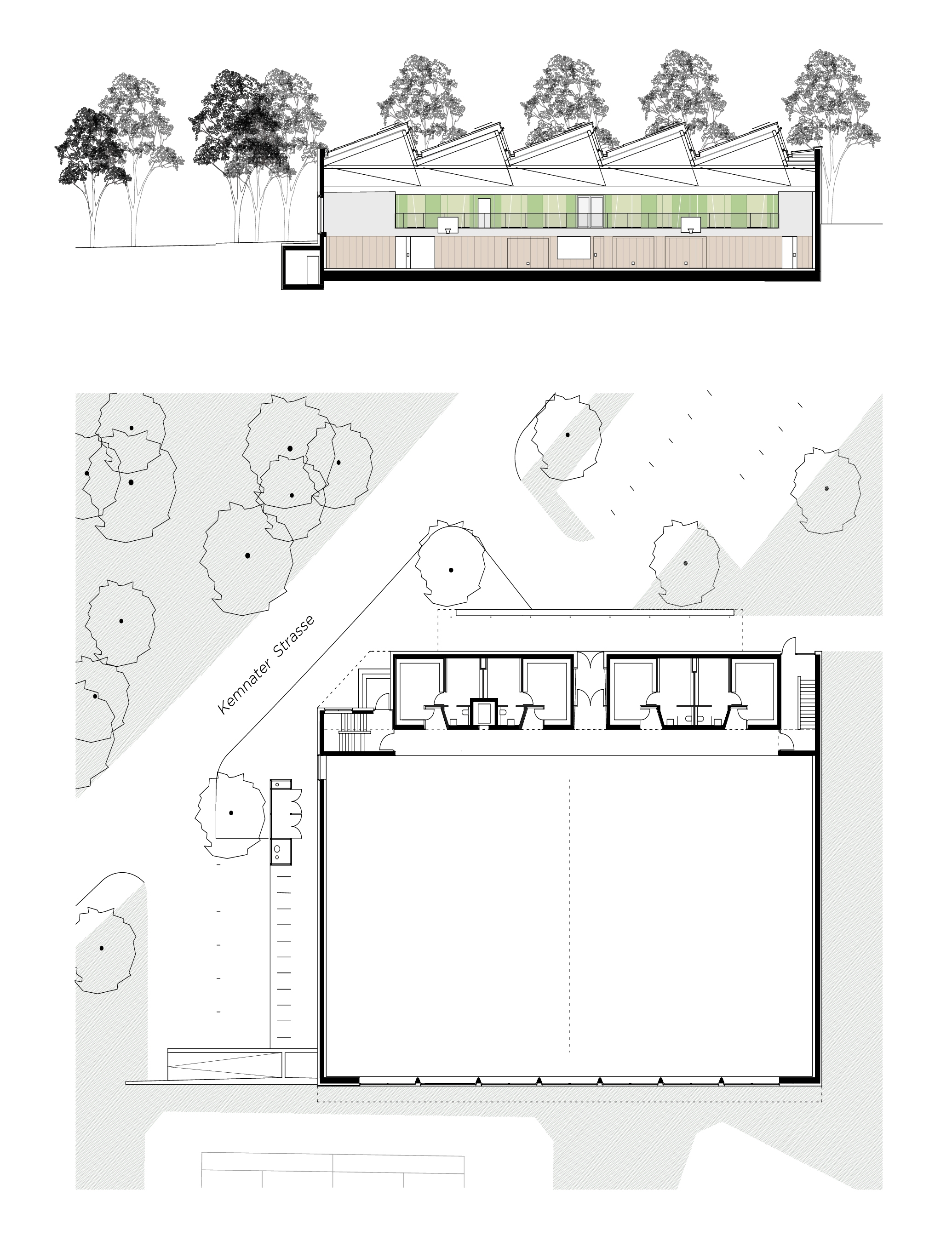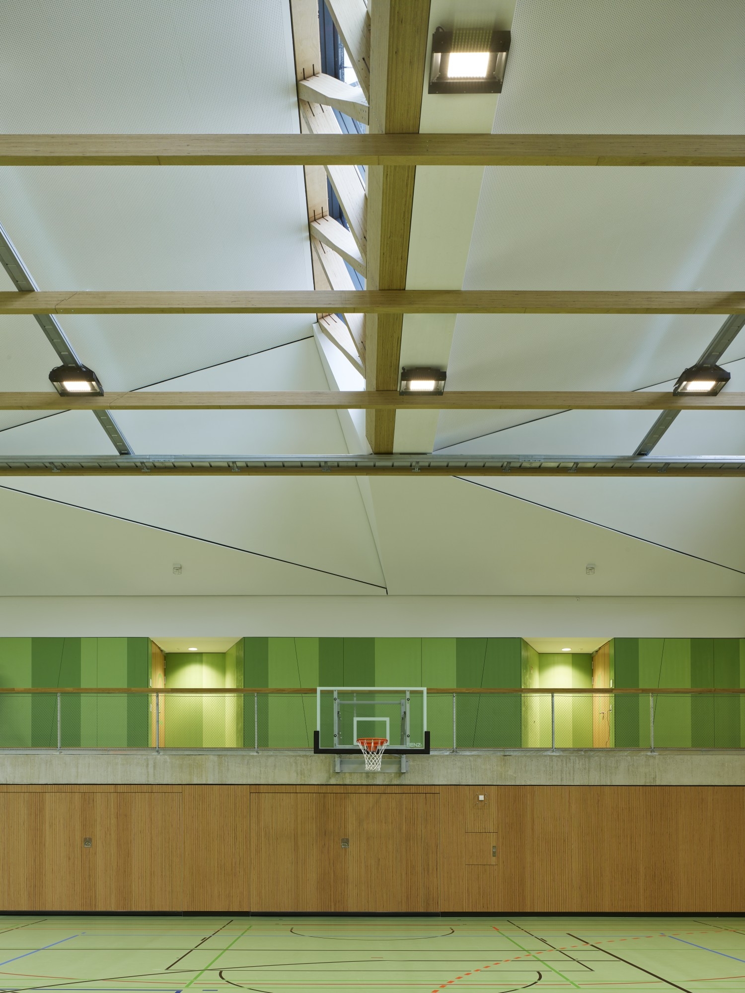 Entwurf: Die teilbare 2-Feld-Sporthalle wird von Schülern der drei im unmittelbaren Umfeld liegenden Schulen genutzt. Sie entspricht den Wettkampfanforderungen von Ballsportarten und ist daher im Vergleich zur normalen Hallengröße nach DIN 18032 um 2,00 m verbreitert. Aus Rücksicht auf die unmittelbar angrenzende Tennisanlage wurde der Boden der Sporthalle um etwa 3,00 m unter das bestehende Gelände abgesenkt. Das Bauwerk ist mit Ausnahme des Dachtragwerks ein Massivbau.