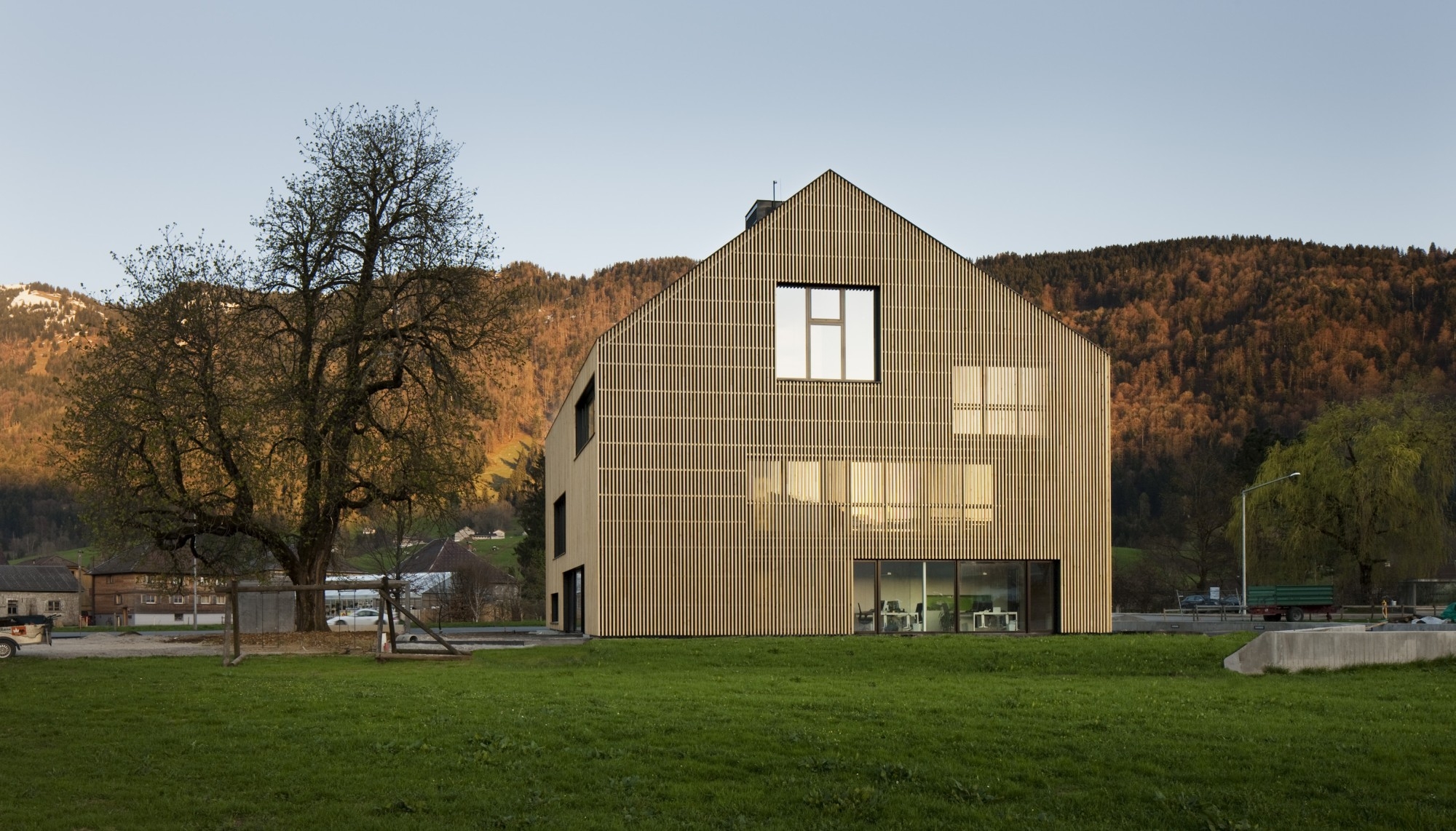 Der kompakte Baukörper mit höchstem Anspruch an Energieeffizienz ist in ein attraktives, transparentes Kleid aus regionalem Weißtannenholz gekleidet.