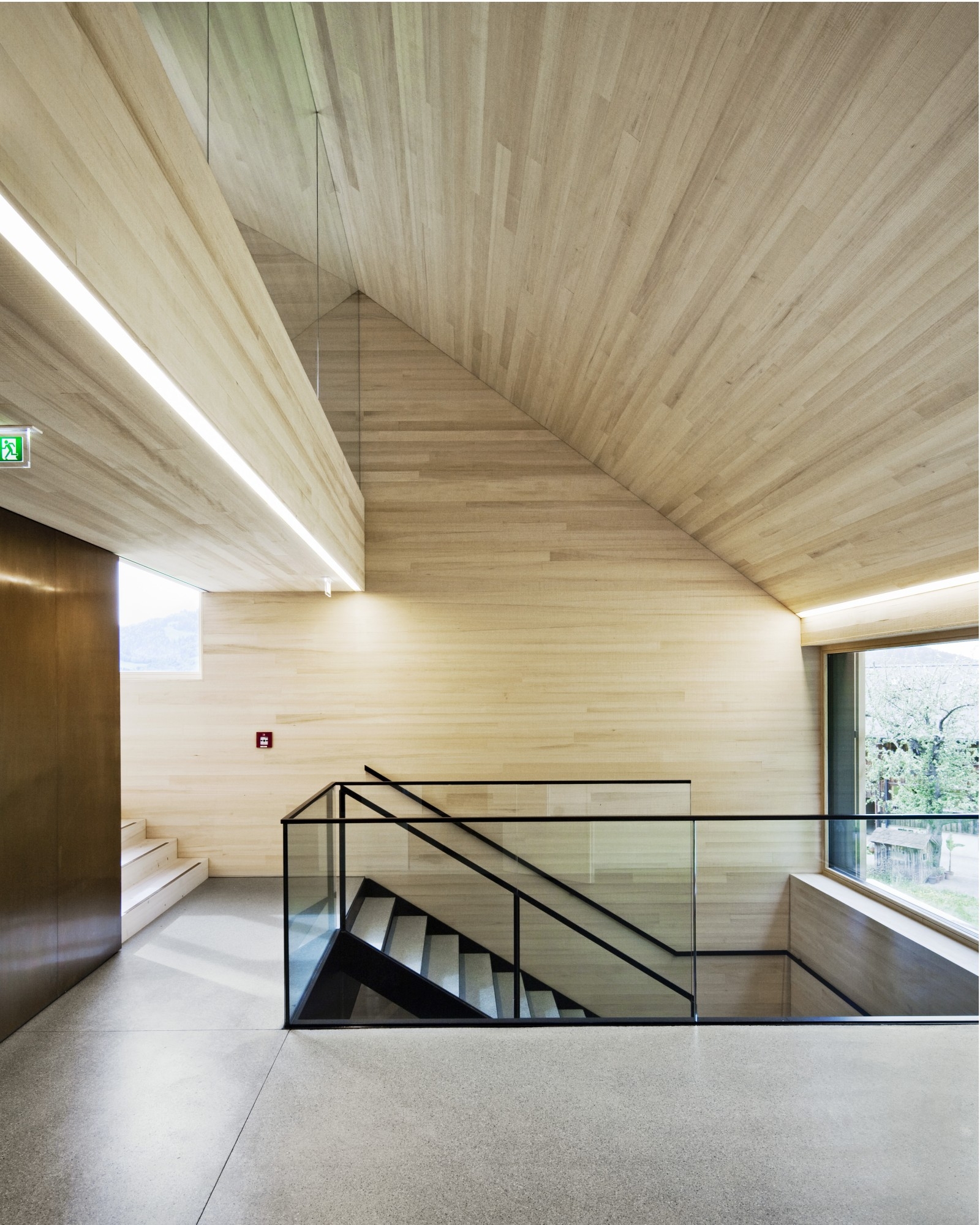 Holz: Der konstruktive Holzbau besteht aus Multiboxdecken mit integrierten Querträgern sowie vorgefertigten Außenwand- und Dachelementen. Im Innenausbau sowie an den Fassaden kam heimische Weißtanne zum Einsatz. Alle Holzoberflächen wurden sägerau und unbehandelt ausgeführt. Es wurden ausschließlich Betriebe aus der Region beauftragt.