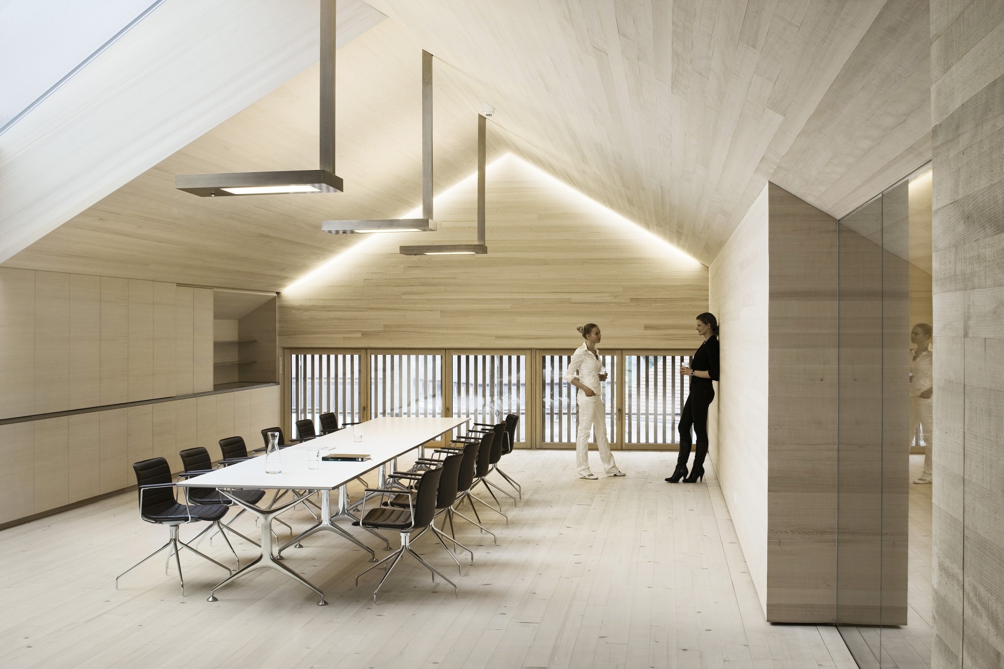 Entwurf: Der Neubau wurde behutsam in den städtebaulichen Kontext eingefügt. Die durchlässige Raumanordnung schafft immer wieder Bezüge zum Außenraum, wodurch zusammen mit der schadstofffreien Raumluft eine hohe Arbeitsplatzqualität entsteht. Für das Projekt wurde eigens eine Deckenlampe mit integriertem Lautsprecher und Notbeleuchtung entwickelt. Das Dachgeschoss steht für kulturelle Veranstaltungen zur Verfügung.