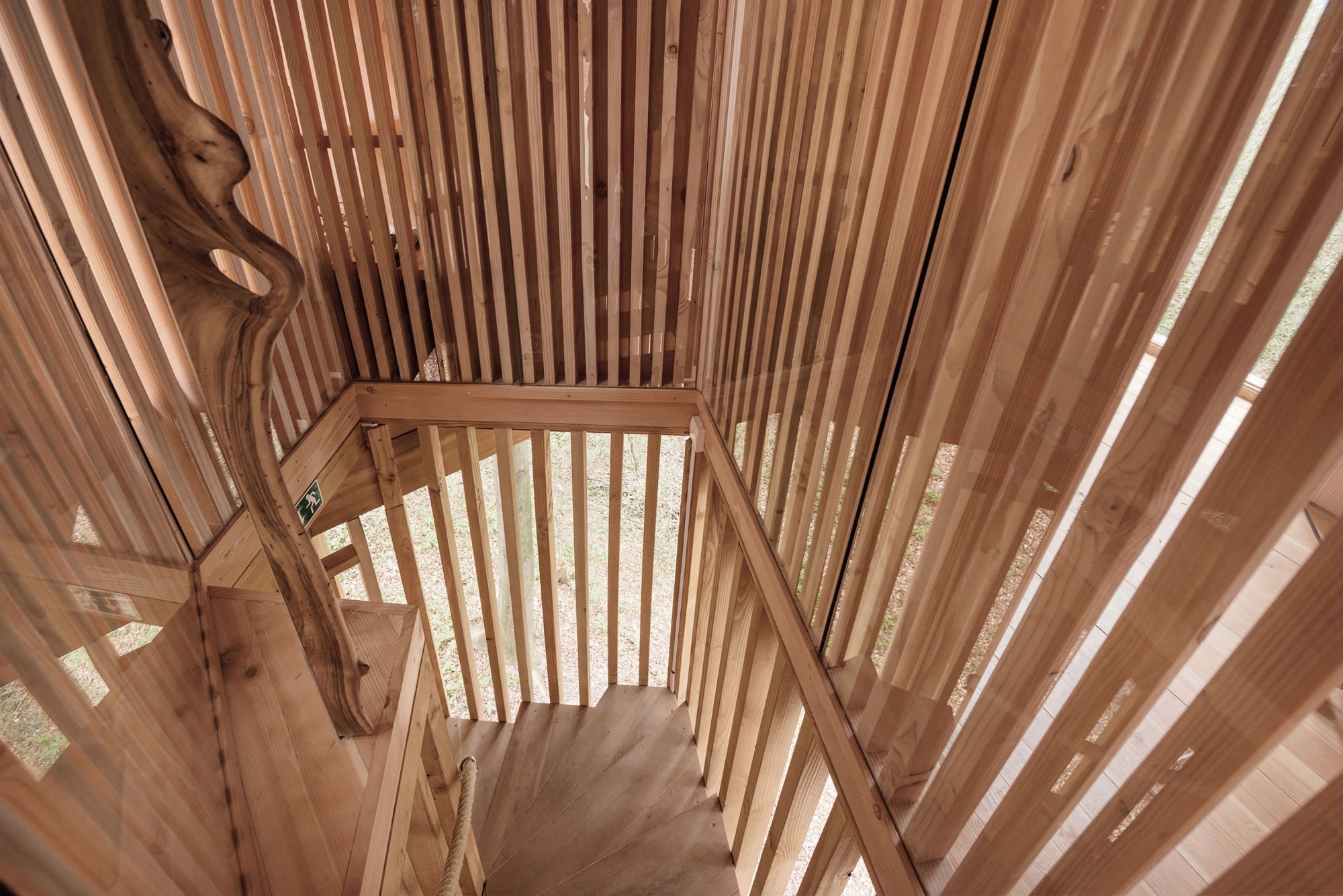 Wood: Douglas fir timber was used for the tree house, cut in the same forest where the building was later built. The head of the local forestry office accompanied the timber from the logging to the processing and finally to the construction stage. The Celje city forest, honoured as the best-managed forest of 2016 in Slovenia, is subject to legal regulations for close-to-nature forestry which are even stricter than the FSC and PEFC standards.