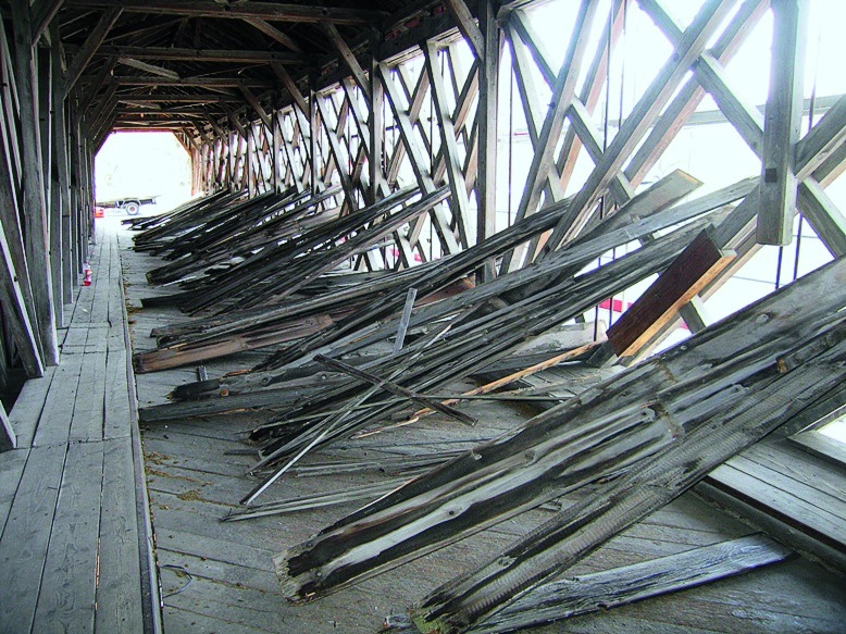 Structure en bois à ferme Howe (membrures supérieure et inférieure avec des barres de traction verticales en fer), revêtement praticable en chêne massif, bardeaux de bois en mélèze