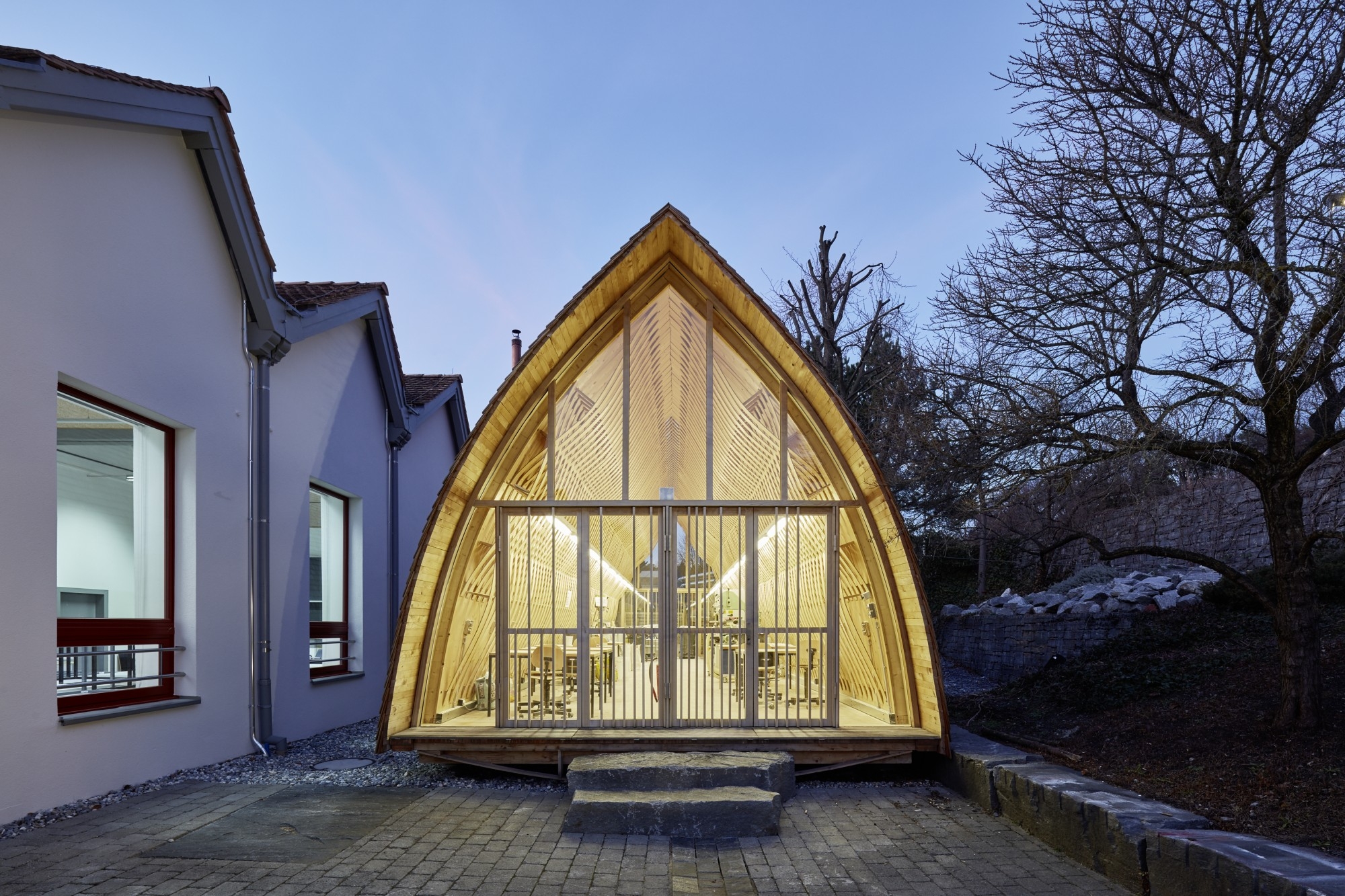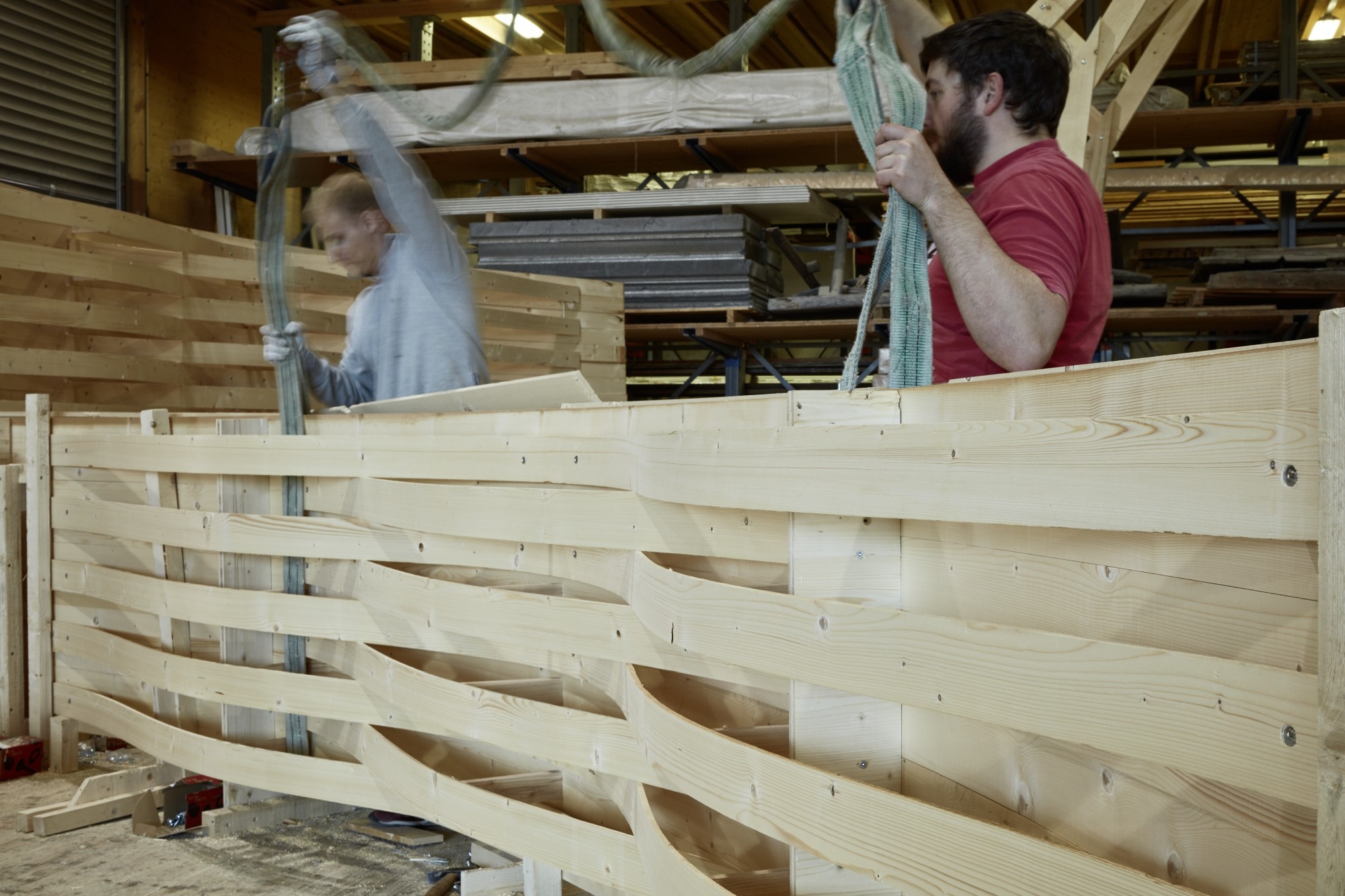 Bois : La structure porteuse se compose de planches courbes, soutenues sur la moitié de leur largeur en décalage et en ondulant. Afin de permettre cette courbure, il était nécessaire de raboter les planches à l'épaisseur appropriée en fonction du rayon. L'optimisation de l'élément porteur individuel a demandé un grand nombre d'essais et de tests de rupture. Le cintrage a été aisément réalisé à la main et avec quelques chandelles d'appui. Une couche de planches stabilise la construction et forme le support pour l'isolation, la ventilation et la protection contre les intempéries à base de bardeaux de mélèze.