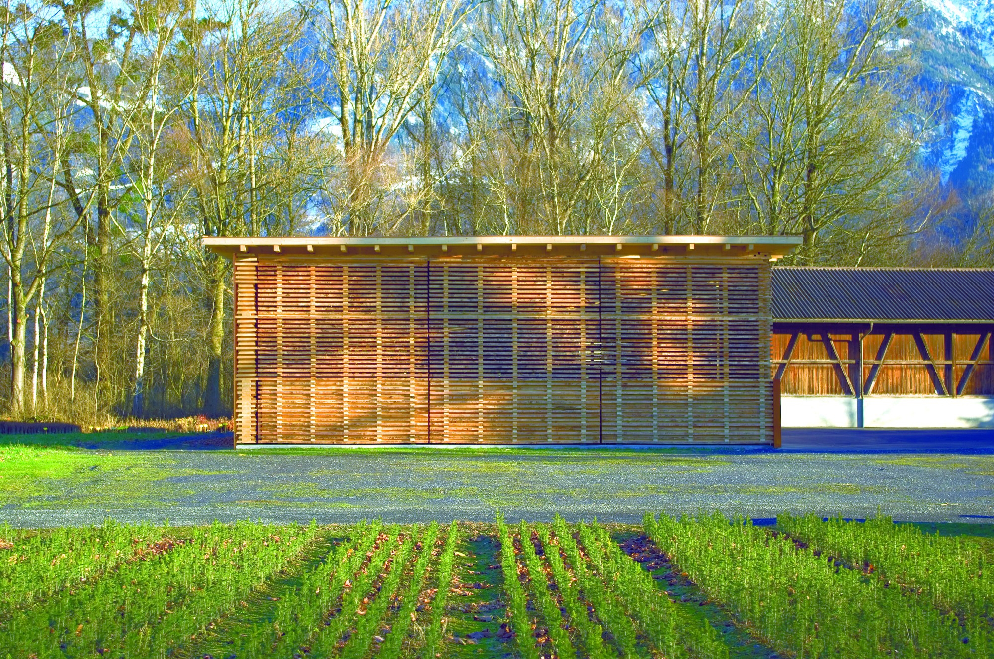 Projet : Le Service des Forêts National avait besoin d’un local pour l’entreposage de ses équipements et véhicules. La pépinière forestière se trouve environ 2 kilomètres au nord du centre de la commune, au coeur de la zone naturelle du « Schaaner Riet ». L’idée était de réaliser avec des matériaux simples un bâtiment fonctionnel qui remplirait les besoins de l’exploitation (culture et soin des forêt et bois de protection). Le bâtiment complète deux autres constructions existantes, formant avec elles une cour ouverte et ainsi le centre de l’ensemble.