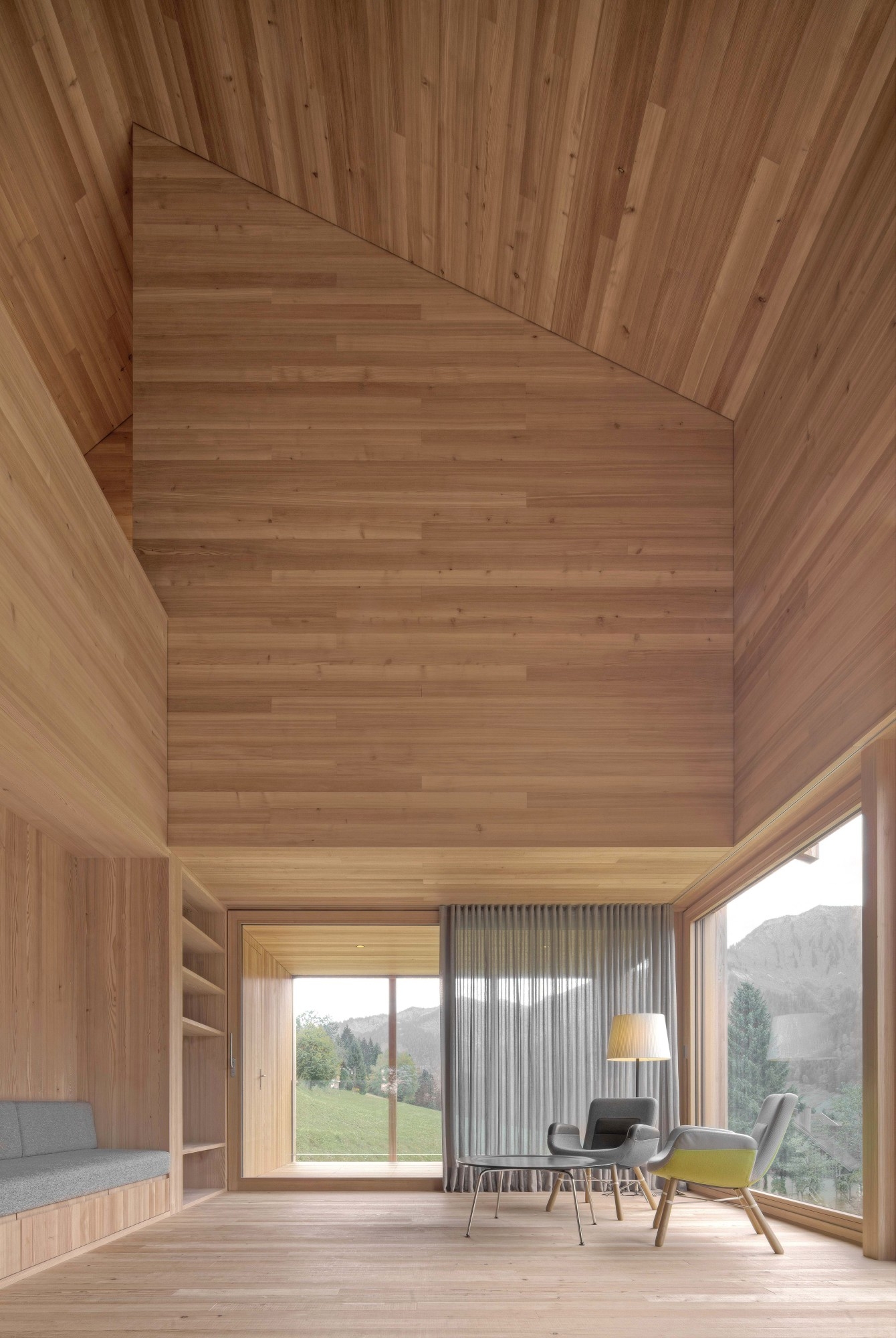 Projet : Dans le hameau Stürcher Wald, cette maison se dresse à 1000 mètres d’altitude sur une parcelle très pentue orientée au sud. L’ouvrage s’inspire d’une part des typologies traditionnelles de l’architecture de la région des Walser (maisons en rondins), mais ce long bâtiment au toit en bâtière casse d’autre part entièrement les modèles classiques pour afficher une modernité radicale. Les pièces se répartissent sur deux niveaux. Les zones d’activités quotidiennes telles que la cuisine et le séjour se trouvent au niveau de l’entrée. Les pièces privées (chambres et salles de bains), qui ont fait l’objet d’un traitement encore plus subtil et raffiné, se trouvent à l’étage. La forme toute en longueur et l’organisation stricte de l’implantation permettent une utilisation optimale de l’ensoleillement du niveau principal, ce qui représente un atout considérable en montagne pendant les longs mois d’hiver.