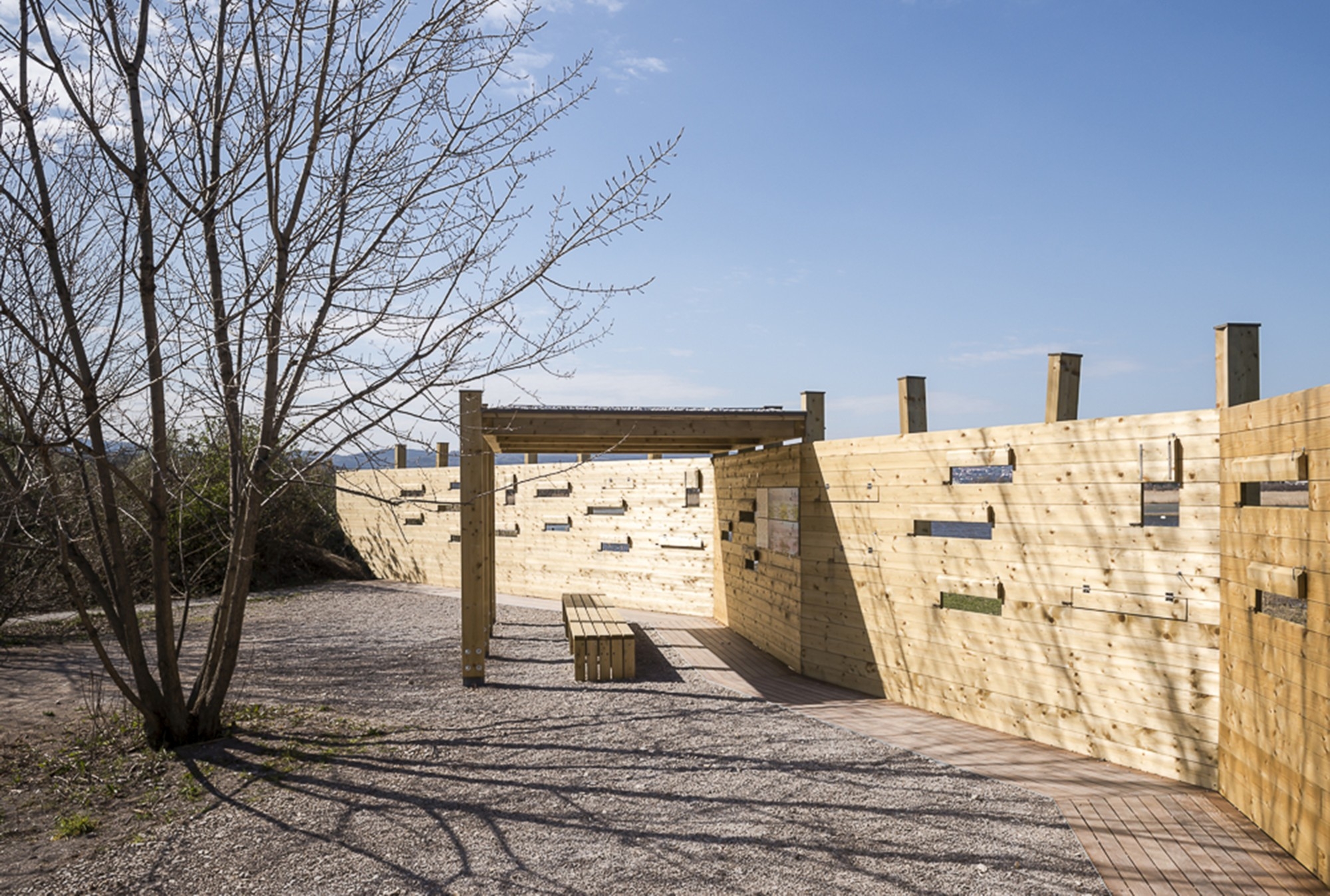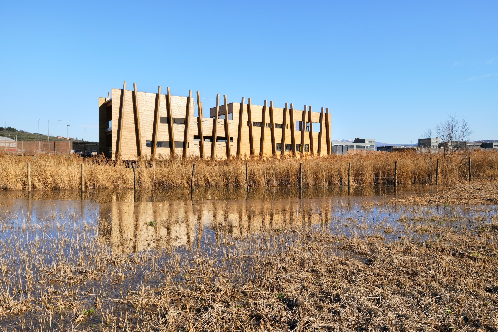 Projet : La réserve naturelle de Škocjan est une précieuse lagune d‘eau saumâtre de l‘Adriatique, entre les axes de transport et la ville de Koper, servant de gîte à de nombreux ongulés et à plus de 245 espèces d‘oiseaux. Les interventions doivent préserver l‘identité du lieu tout en plaçant des touches architecturales. Majoritairement le long d‘un sentier didactique dans la partie orientale de la réserve, 14 constructions sont disposées, qui servent notamment à observer la nature et assurent des fonctions comme, par exemple, un bâtiment d‘hébergement ou une plateforme d‘observation. Le bâtiment principal à trois étages forme le point de départ du circuit et abrite un centre d‘information sur la région protégée.