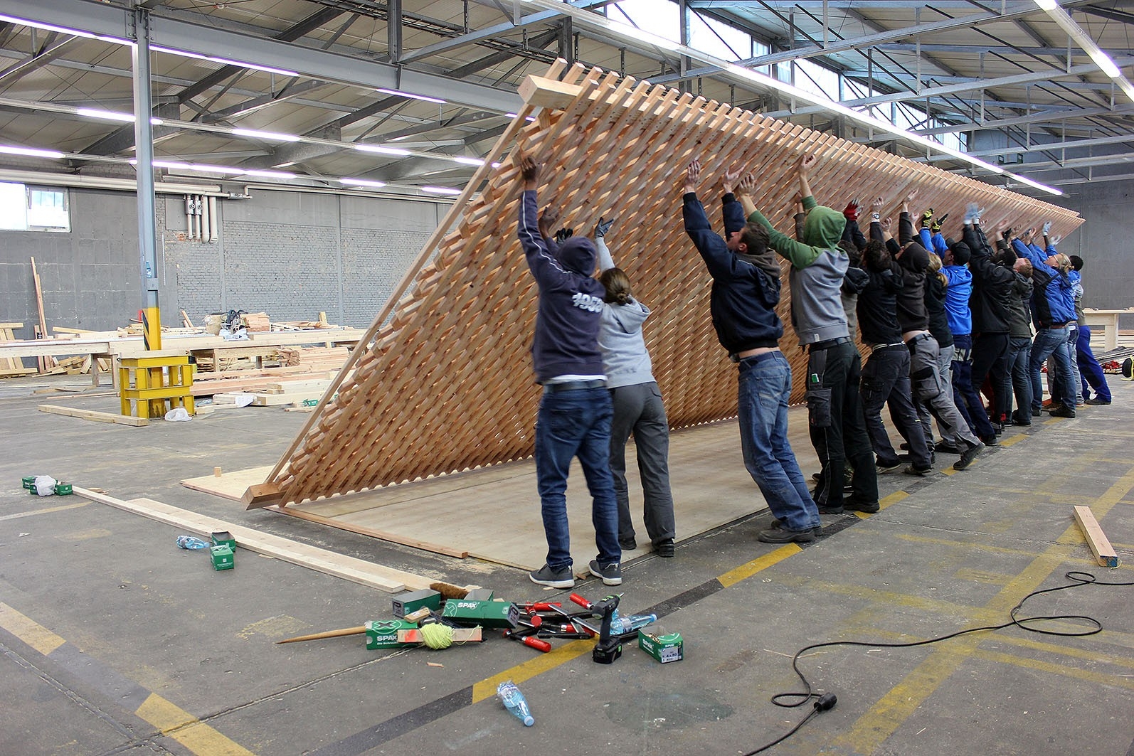 Groupe d'étudiants de l'atelier U20 avec des réfugiés du centre de premier accueil régional Spinelli ; Centre artisanal du bois, Mannheim (DE)