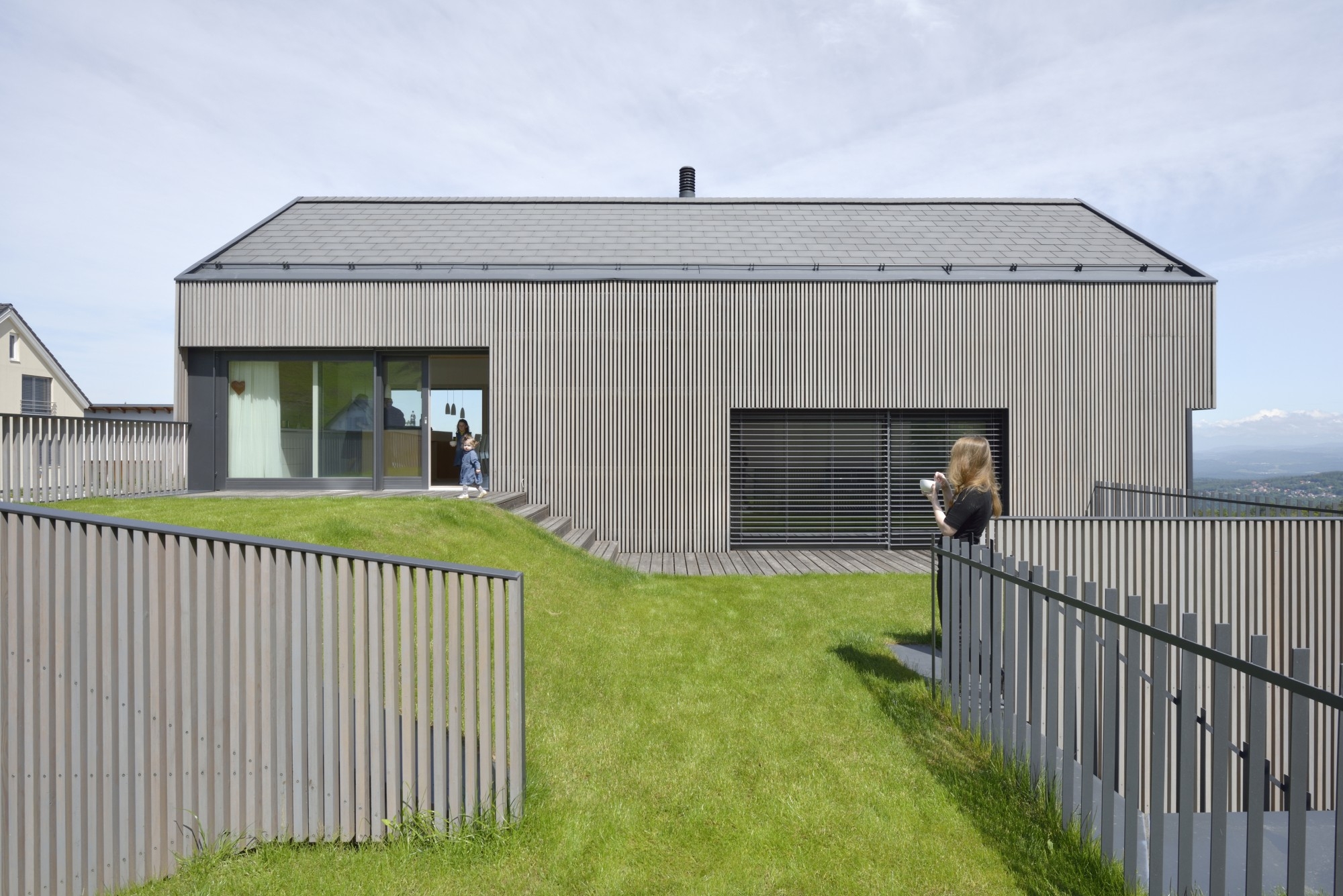 Bois : De grands panneaux de bois lamellé croisé forment l‘enveloppe porteuse du bâtiment. Elle a été encadrée par deux châssis en acier pour la stabilisation sismique. L‘espace de vie principal, sur plusieurs niveaux, peut ainsi rester ouvert, aucune cloison n‘est nécessaire. La toiture en panneaux de bois lamellé croisé massifs, ainsi que la galerie ont été suspendues aux châssis.