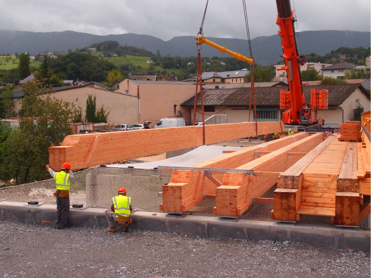 Projet : Le pont de Cognin est le plus long pont routier en bois de France. La structure porteuse innovante, basée sur des poutres en bois associées à un tablier en béton armé, est unique en France. Une très grande section de bois a dû être choisie pour les poutres de 40 m de long afin de pouvoir utiliser le bois noueux de douglas régional.