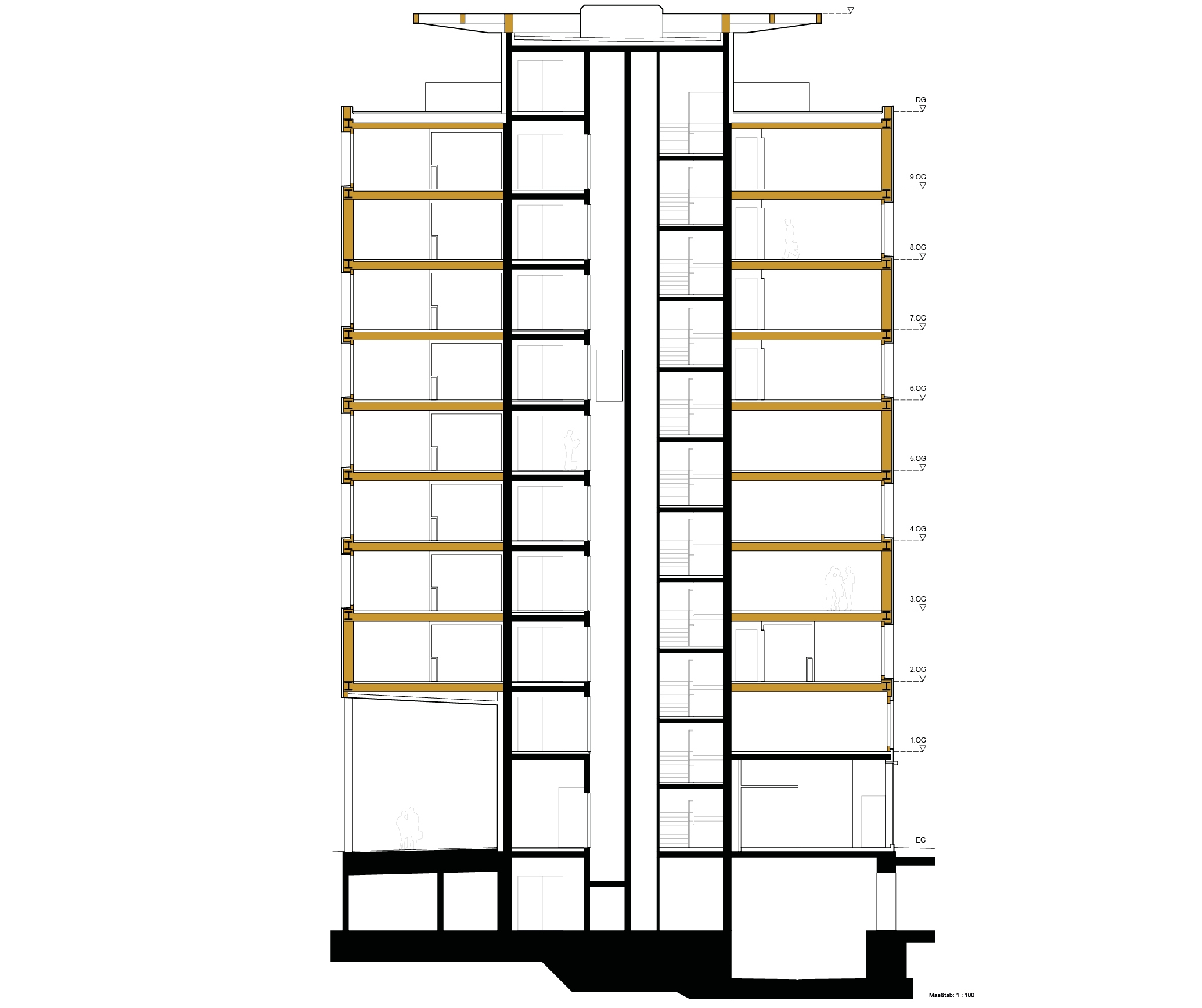 Bois : Le bâtiment est conçu sous forme de construction hybride. Le bois (épicéa) représente la majeure partie de la construction, la cage d‘escalier et le soubassement sont en béton armé. Les salles de bain sont des modules autoporteurs préfabriqués. Aux étages supérieurs, la structure porteuse se compose d‘une construction hybride bois-acier selon le principe de l‘ossature.