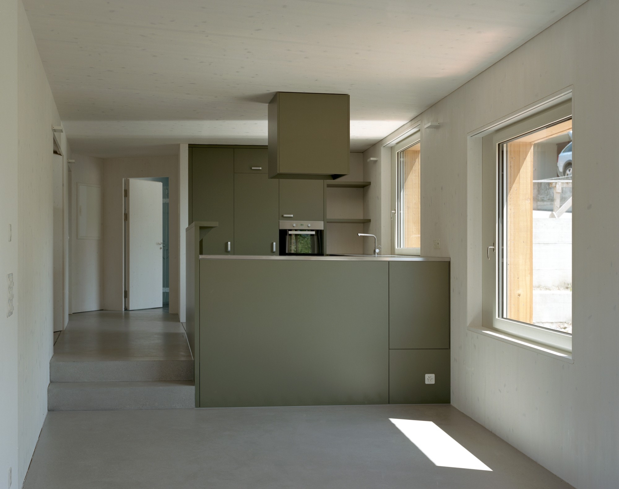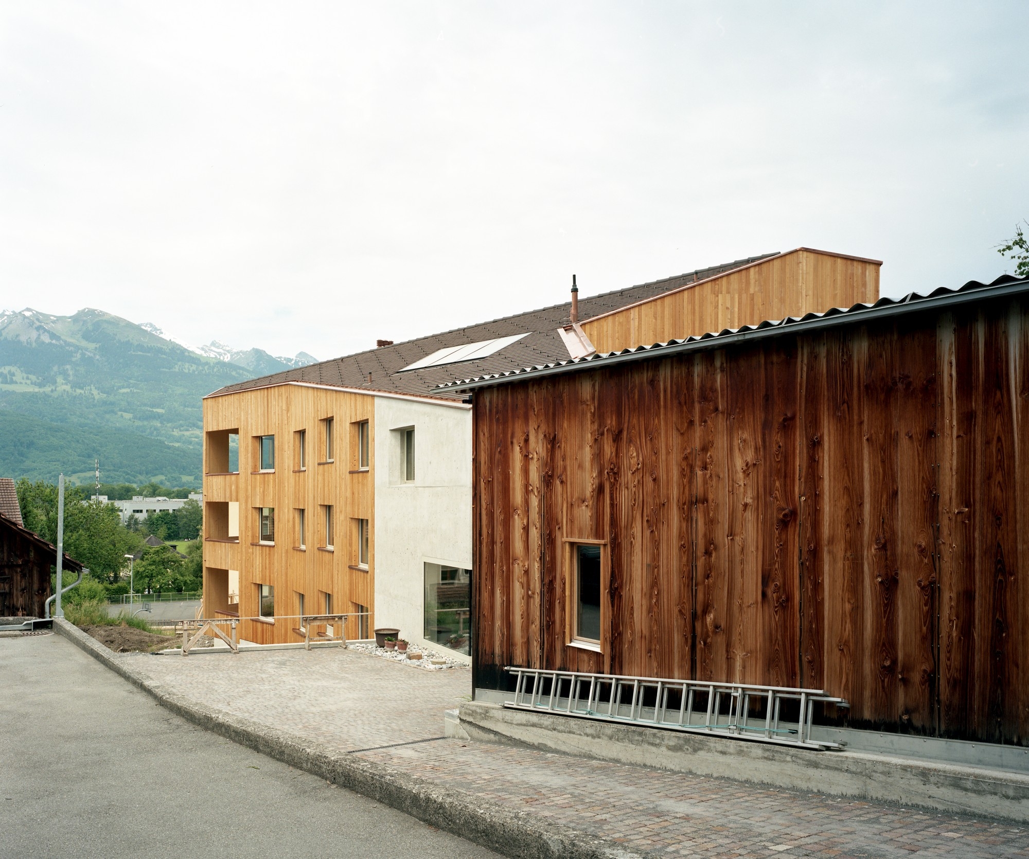 Legno: L’edificio è una costruzione in legno massiccio senza rivestimento, le cantine e la colonna scale sono in calcestruzzo con isolamento integrato. La costruzione in legno massiccio (con pannelli a tre strati dello spessore di 120 mm) ha permesso di realizzare una struttura pulita e omogenea separando le diverse funzioni. La facciata in larice locale non è trattata ed è destinata ad ingrigire naturalmente in modo diverso a seconda dell‘esposizione. Le pareti in legno massiccio sono visibili all’interno e trattate solo con una mano leggera di smalto bianco. La geometria estremamente complessa ha potuto essere prefabbricata con grande precisione grazie al taglio digitale delle lastre di grande formato ed essere montata nel giro di 3 giorni.