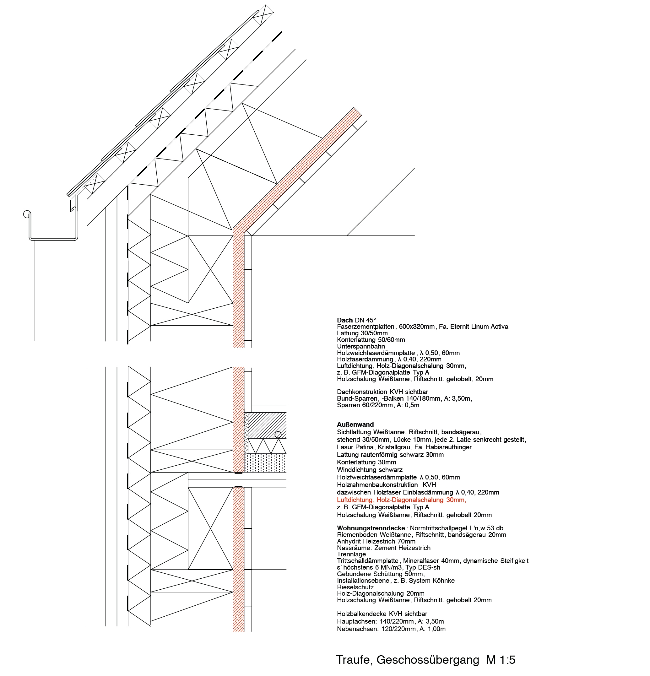 Pareti: struttura con intelaiatura in legno (legno strutturale pieno); soffitto con travi a vista; tetto in legno strutturale pieno; barriera anti-vapore tramite rivestimento diagonale in legno con valore sd 1,2 m