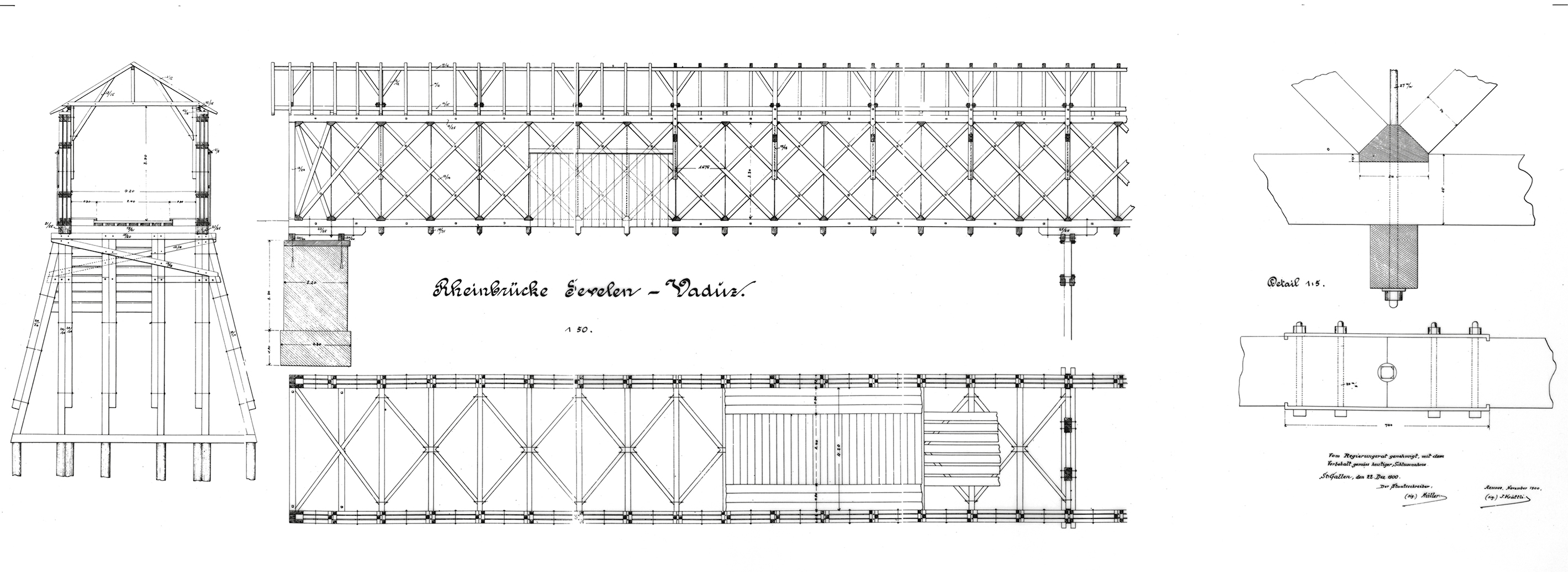 Storia: Un primo ponte sul Reno fu costruito nel 1871. 30 anni più tardi però, a causa di una manutenzione insufficiente, si rivelò tanto malconcio che ricostruirne uno nuovo costava meno che ristrutturarlo. Nel 1901 fu terminato il nuovo ponte, costruito sulle pile e usando il legno del suo predecessore. Fino al 1975 il ponte costituiva l’unico collegamento tra i comuni di Vaduz e Sevelen (carico utile 6 tonnellate), oggi svolge la funzione di ponte pedonale e ciclabile. In quanto unico ponte in legno superstite tra Liechtenstein e Svizzera e al di sopra del Lago di Costanza è protetto come monumento storico da ambedue i paesi.