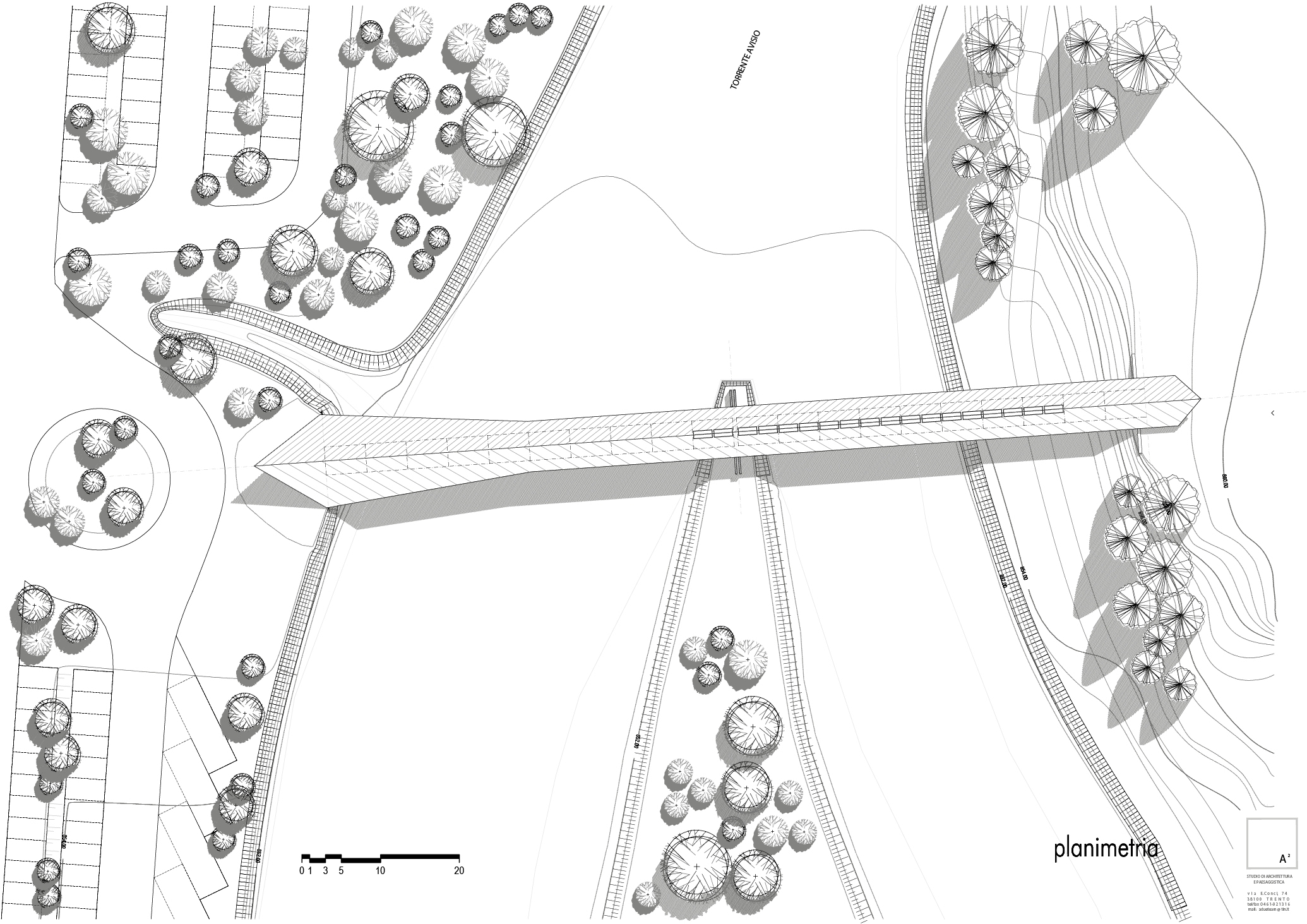 Design: The Cavalese cable car disaster of 1998 left the Alpe Cermis ski resort, situated at an altitude of 850 meters, without access from the municipality of Cavalese. A new bridge for pedestrians and bicyclists was set to be built in order to span the Avisio River valley and reconnect the resort with the town and the main parking lot. The length of the bridge is a total of 104.5 meters with an incline of 4%, in order to manage the difference in height between the two banks. As an important infrastructure measure for local tourism situated in a natural preserve, the bridge was designed to feature an expressive form language guided by local traditions.