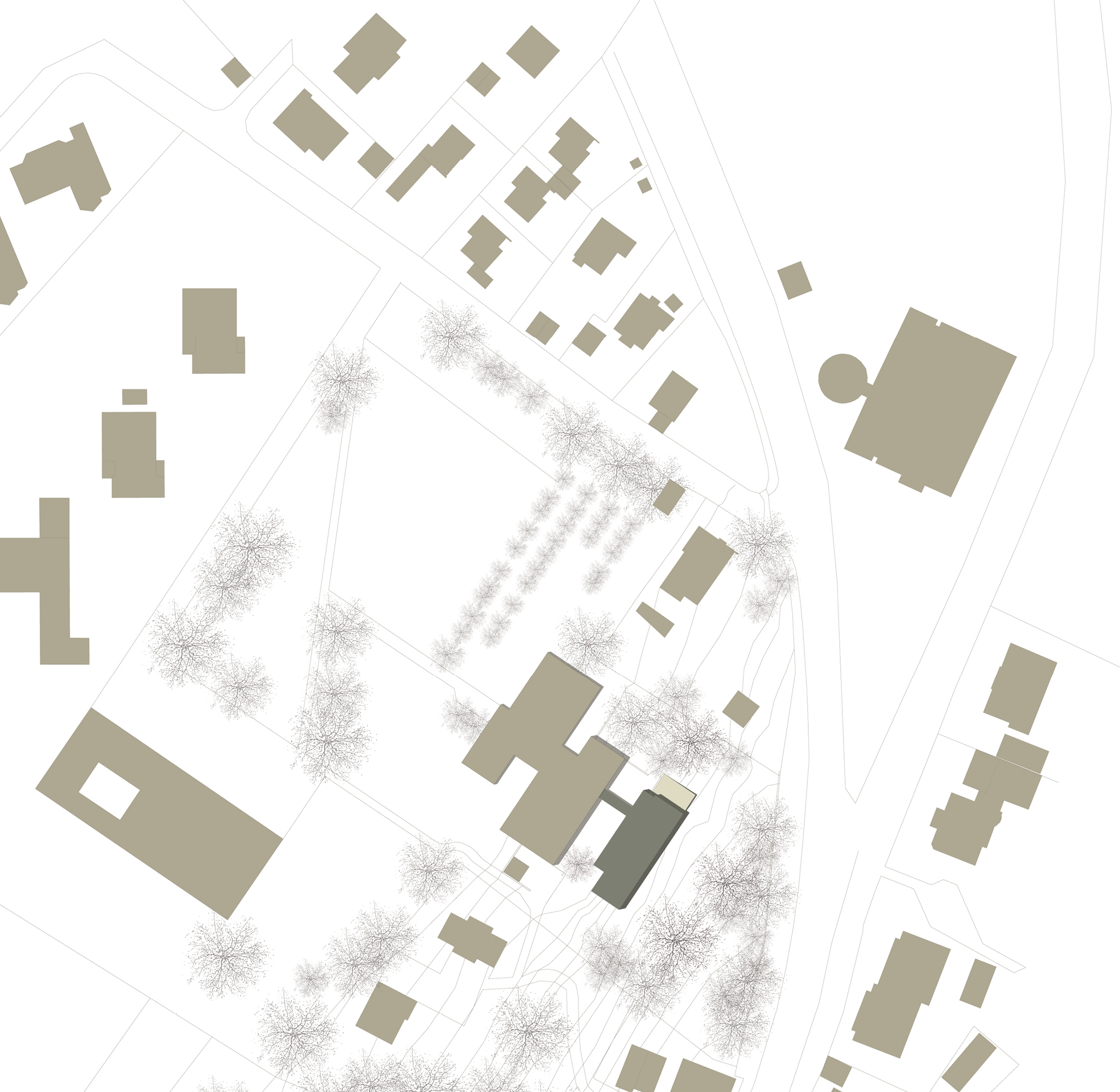 Wood: The new building is made of prefabricated wooden panels. The load-bearing wall and ceiling elements and the interior columns reveal their surface of spruce wood. The exterior of the building is clad in lacquered white fir wood to protect the façade from greying. The glazing throughout is made of wooden window frames of white fir wood protected by aluminium profiles. All materials and surfaces have retained the original colour of the materials.