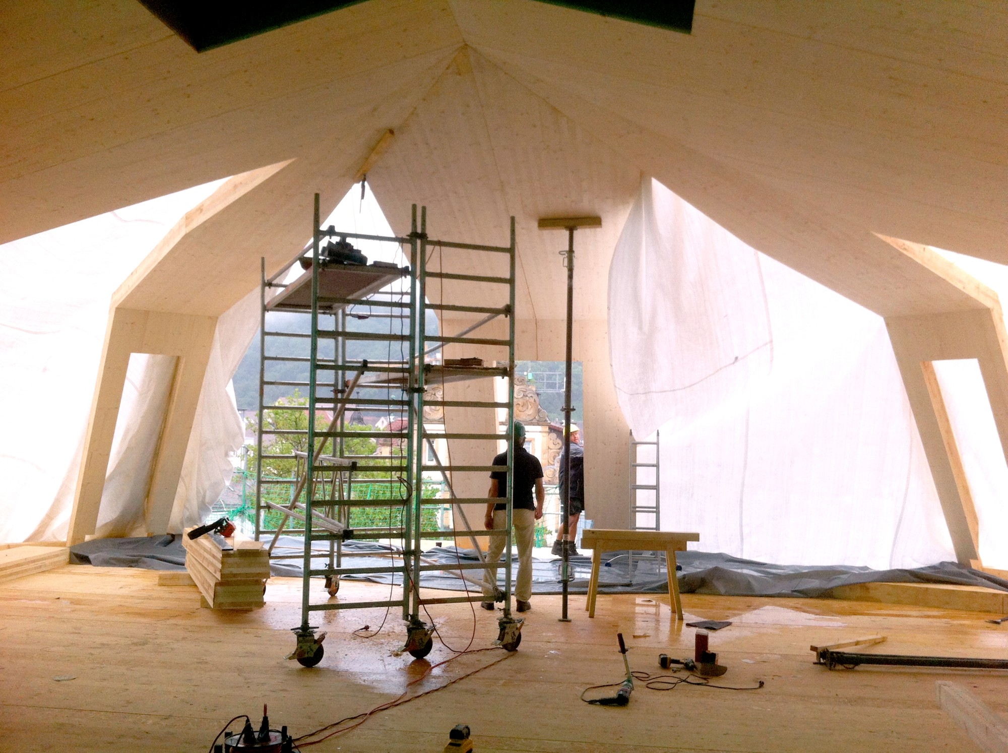 Wood: The mansard roof structure, cantilevered over a base area of 15x50 meters, was set on top of a massive timber ceiling built over the existing building structure. This likewise cantilevered cross-laminated timber ceiling with a thickness of 20 cm is tightly connected to the roof and absorbes the shearing forces. The entire construction consists of prefabricated CLT elements. This vertical extension serves as an exemplary solution for how to meet the demand for space in urban areas by redensification without burdening the neighborhood with time-consuming construction work. The optimized planning and prefabrication process also made for the economically most sensible solution.