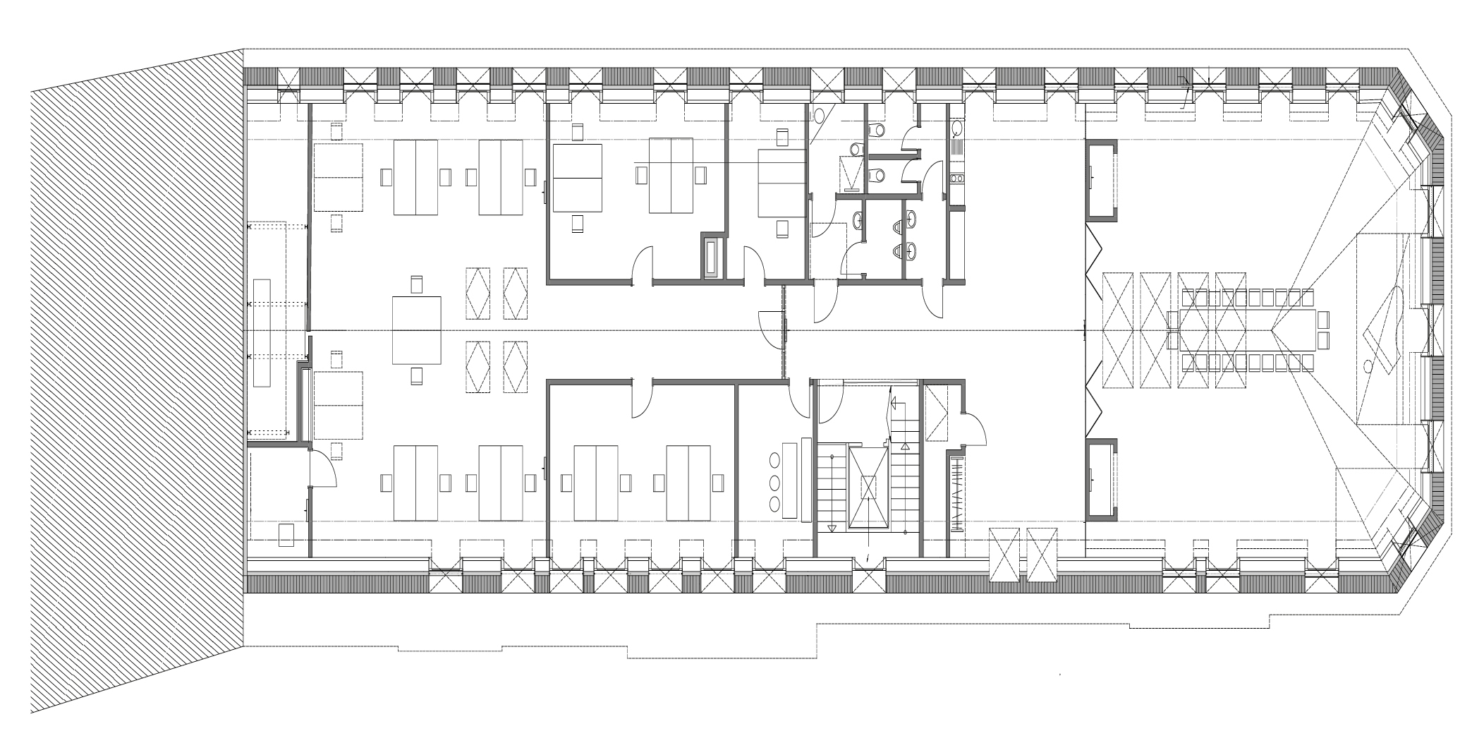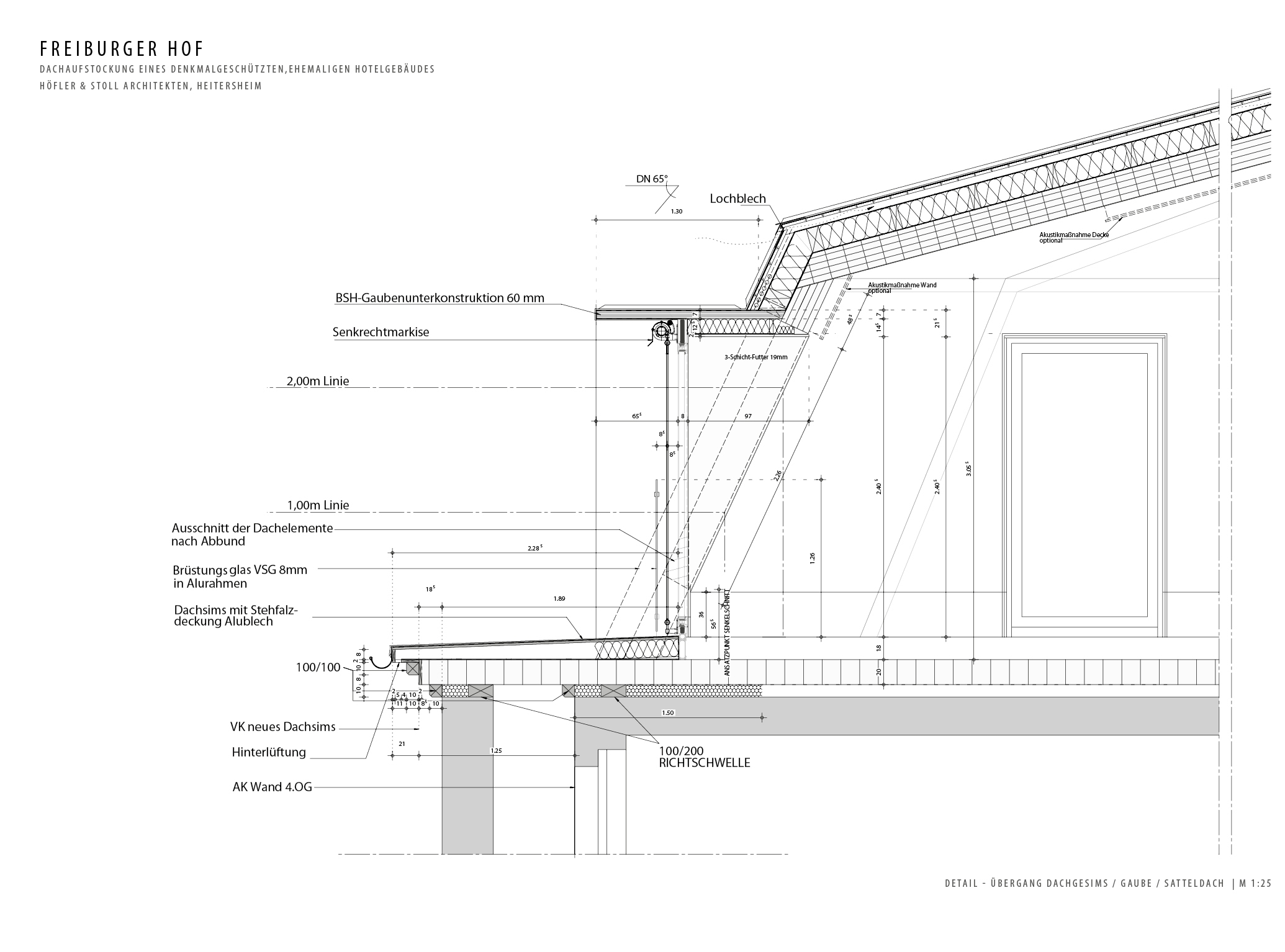 Design: The „Freiburger Hof“, constructed around the year 1900, was substantially damaged in World War II and then vertically extended with an additional floor and a pitched roof in the 1950s. A recently realized new extension created new spaces for events and offices in a special atmosphere within 6 months building time. At the same time it is giving the historical facade of the building a contemporary conclusion that is true to its historical heritage. The rooftop was redone as a mansard roof with numerous dormers placed tightly side by side, citing its historical predecessor.