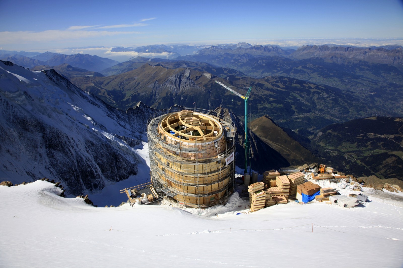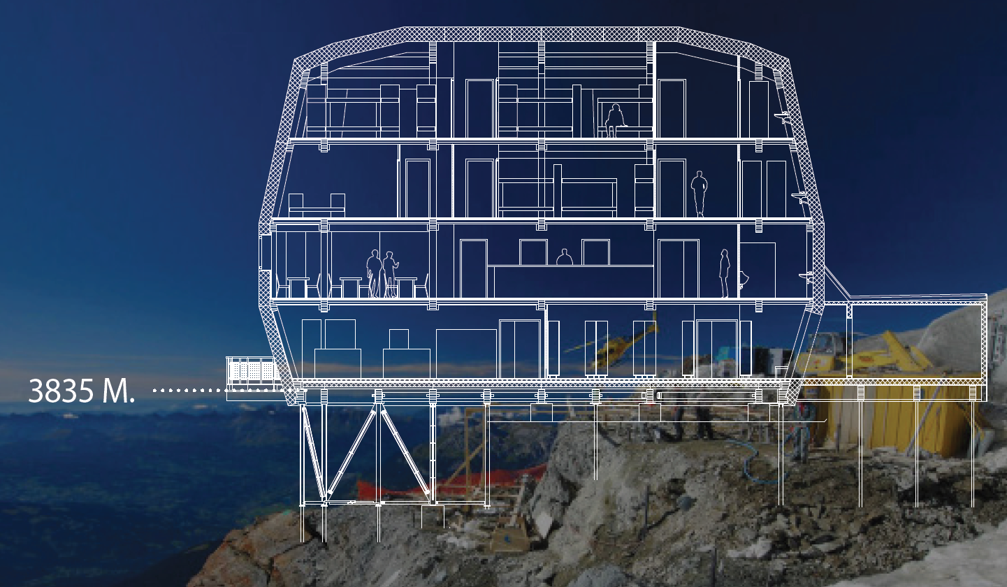 Design: The mountain shelter offers a restaurant and overnight accommodation and is open 98 days a year. The elliptical structure has been designed to cope with the technical and aesthetic challenges of an exposed site with wind speeds of up to 300 km/h.