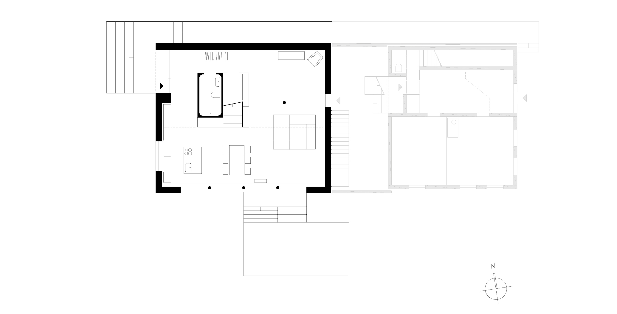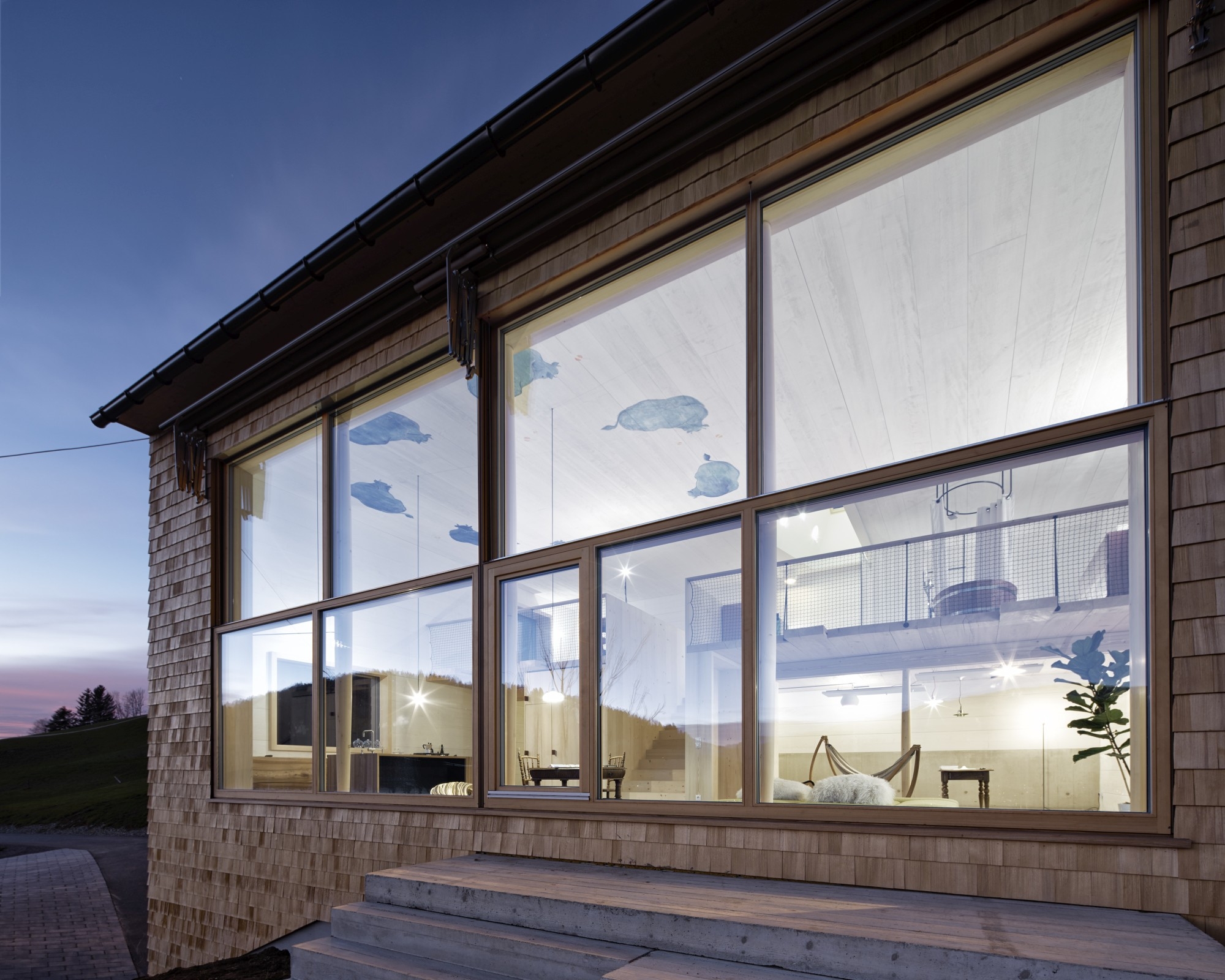 Design: The project is a statement for minimalism in buildings and proves that great indoor environment qualities can be achieved through simple means. The newly created room serves as a base framework for variable uses. A generous open room without any walls – except for a room-in-room solution accommodating side rooms and the stairs to the gallery. The loft is characterized by its large glass facade to the south of 8x4 meters, allowing for an extensive view of the village and the mountains. The project deliberately went without hidden services and interior finishing. The concrete floor on the ground level, colored by the soot from the old barn, and the massive timber beam ceiling up on the gallery are essential to the refined timber frame construction. By opting against the use of a standardized interior finishing, the raw surfaces and natural materials define the atmosphere and charm of the building.