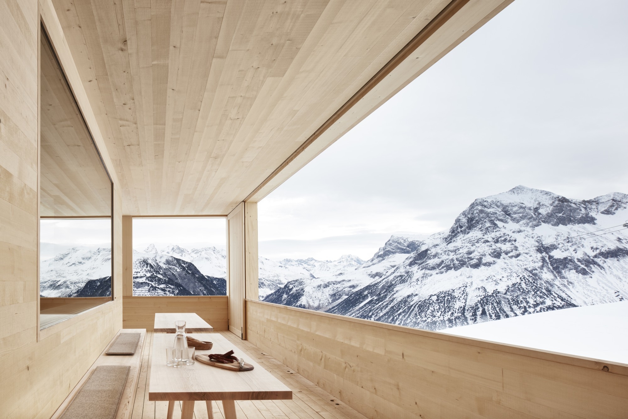Design: The ski hut Wolf is picture-perfect as a lodge: standing at 22 meters of length, 16 meters of width and 7 meters of height, it rests on a concrete base level looking out onto a stunning mountaintop backdrop at an altitude of 2,000 meters above sea level. The covered terrace, with a depth between 2.20 and 3 meters, accommodates 48 guests. In many aspects, the ski hut is typical for Alpine buildings. For centuries, buildings in the mountains have been set on brick-built base levels. With concrete today playing the role of brick, the principle is still the same: Protecting the wood, perfectly suited to withstanding the extreme climate of the Alps when used correctly in construction, from the destructive influence of moisture.