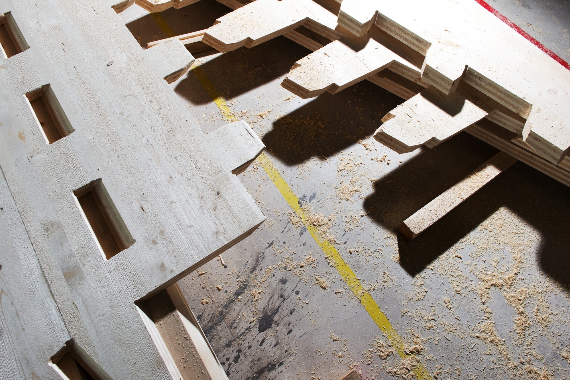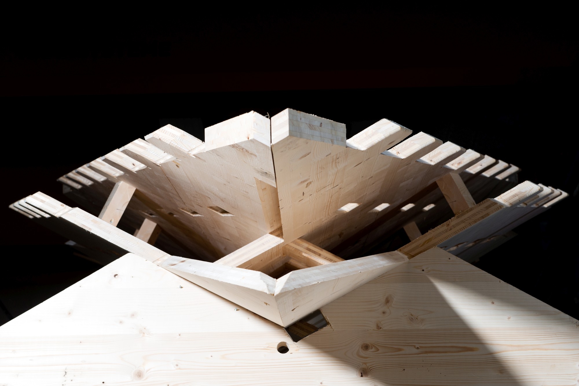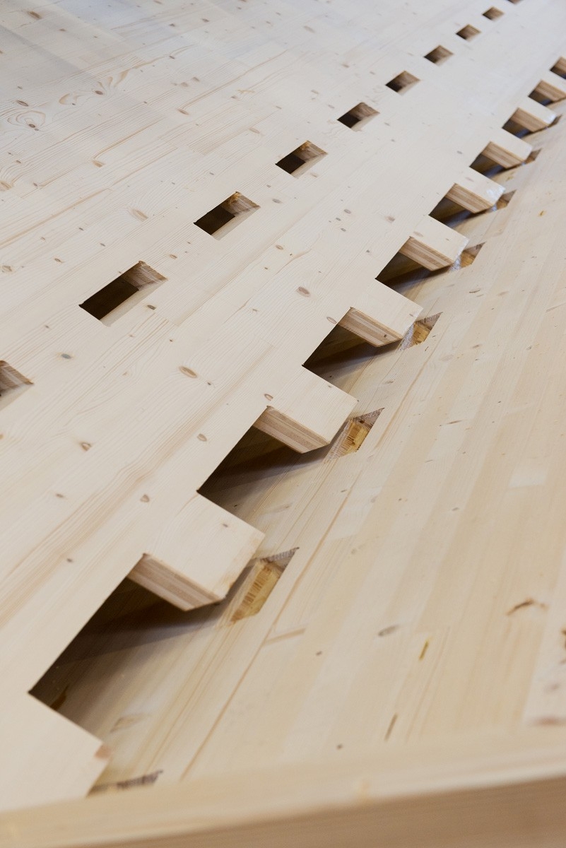 The pavilion is made up of a structural system realized here for the first time: timber panels joined through innovative wood-wood connections.
