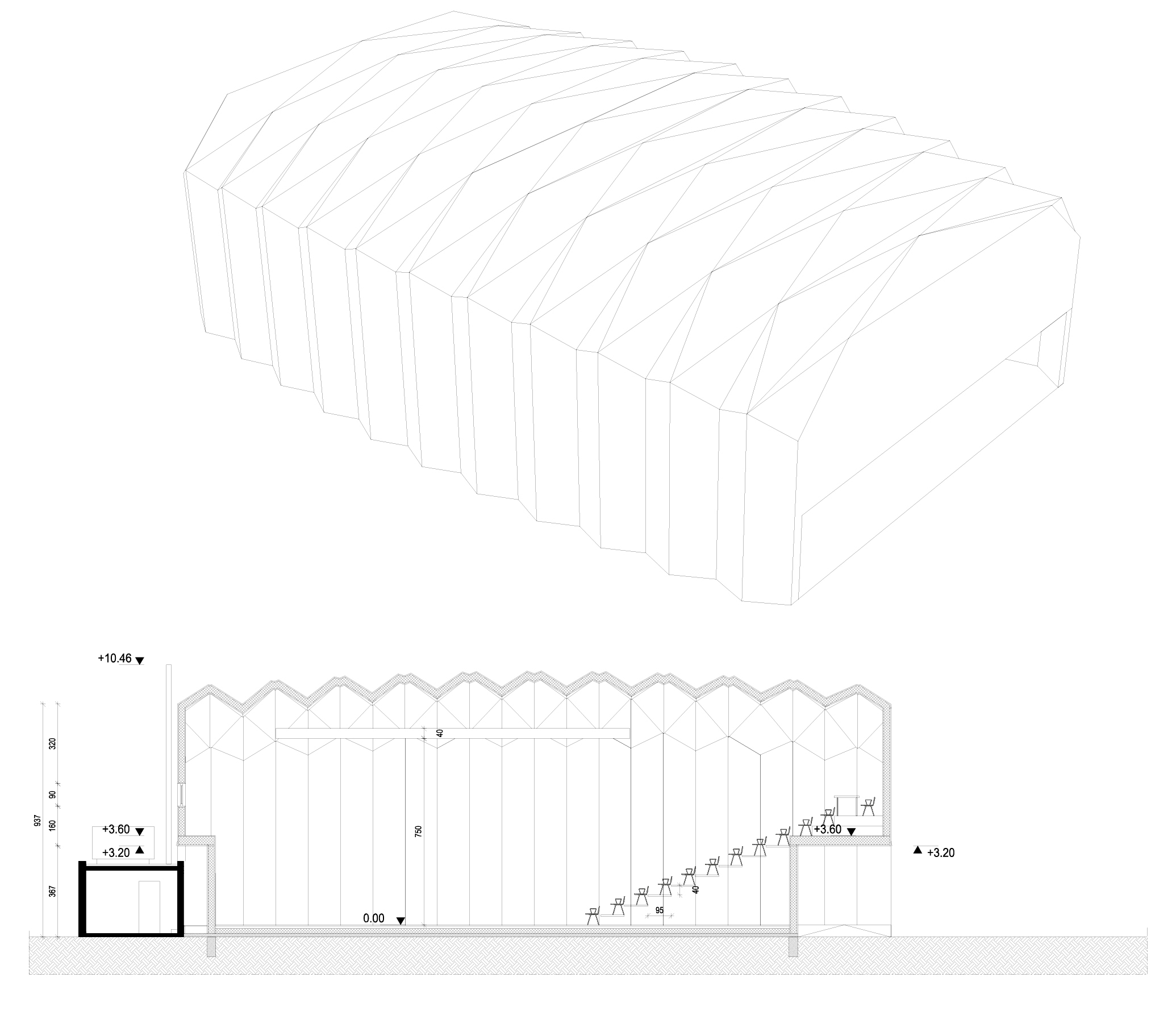 Wood: The pavilion’s structural system consists of a double-layered folded timber plates and does not use any screws, nails, or adhesives for connections. With a plate thickness of only 45 millimetres, the structure achieves a span of up to 20 meters without any additional supports. The cross laminated timber plates are connected through newly developed double tenon joints, inspired by traditional wood joinery. They allow for fast, precise, and easy assembly. The pavilion can also just as easily be disassembled. What makes these wood-wood connections special is that they are integrated into the panels. Thus, the construction requires highly customized prefabrication – the connections and panels are cut in a single operation using 5-axis CNC technology. Once assembled, the timber panels form the entirety of the structural system, minimizing the need for metal connections. The double-layered folded timber plate structure achieves its stability through the stiffness of its connections. This is the first-time innovative wood-wood connections were used for a building of this size.