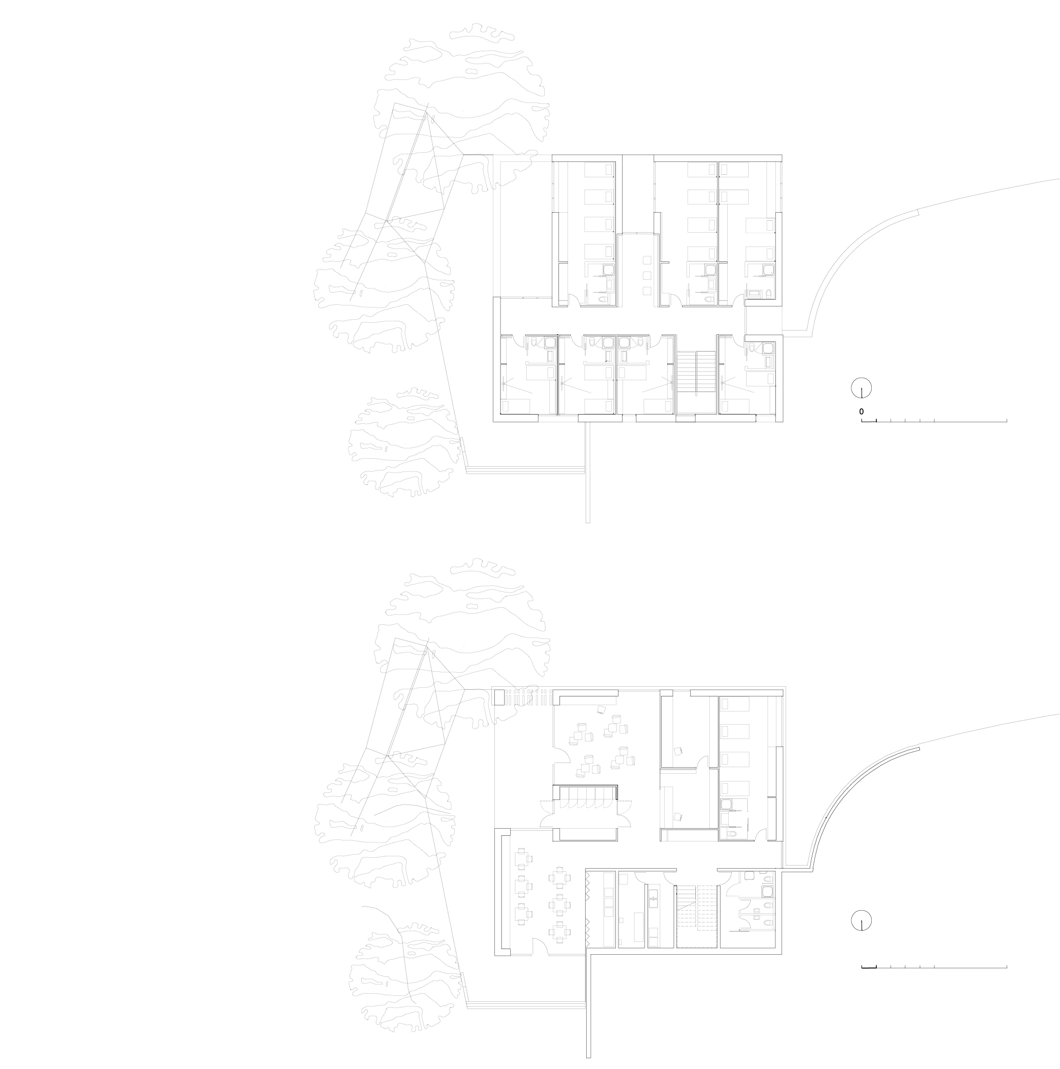 Design: The youth hostel is situated in a small park on a tree-covered hill above the town, also featuring an elementary school, a social work center, a library and several indoor and outdoor sports facilities. Two impressive trees frame the way to the reception area of the cubic building, housing sleeping accommodations and common spaces for up to 48 persons. As a modern landmark of the town, the hostel is also used for a variety of public uses.