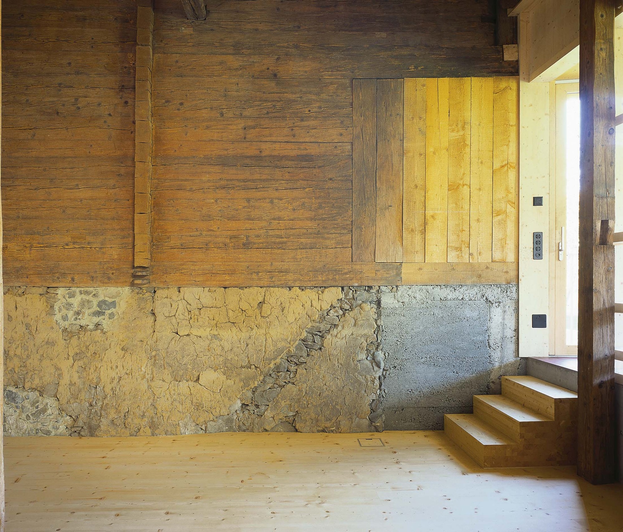 Les: Izbira materialov je sledila obstoječemu stanju; v kolikor je bilo mogoče, so bili ohranjeni obstoječi materiali in elementi. Obstoječa škatlasta okna so bila s pomočjo novih tesnil ojačana za sodobne potrebe. Streha je bila na novo prekrita z obstoječimi opečnatimi strešniki, pred tem pa je bila na nosilne tramove dodana izolacijska plast. Skedenj je med tramovi dobil izolacijo; zunanjost je oblečena v grobo žagane smrekove deske, notranjost pa v tri slojne lesne plošče.