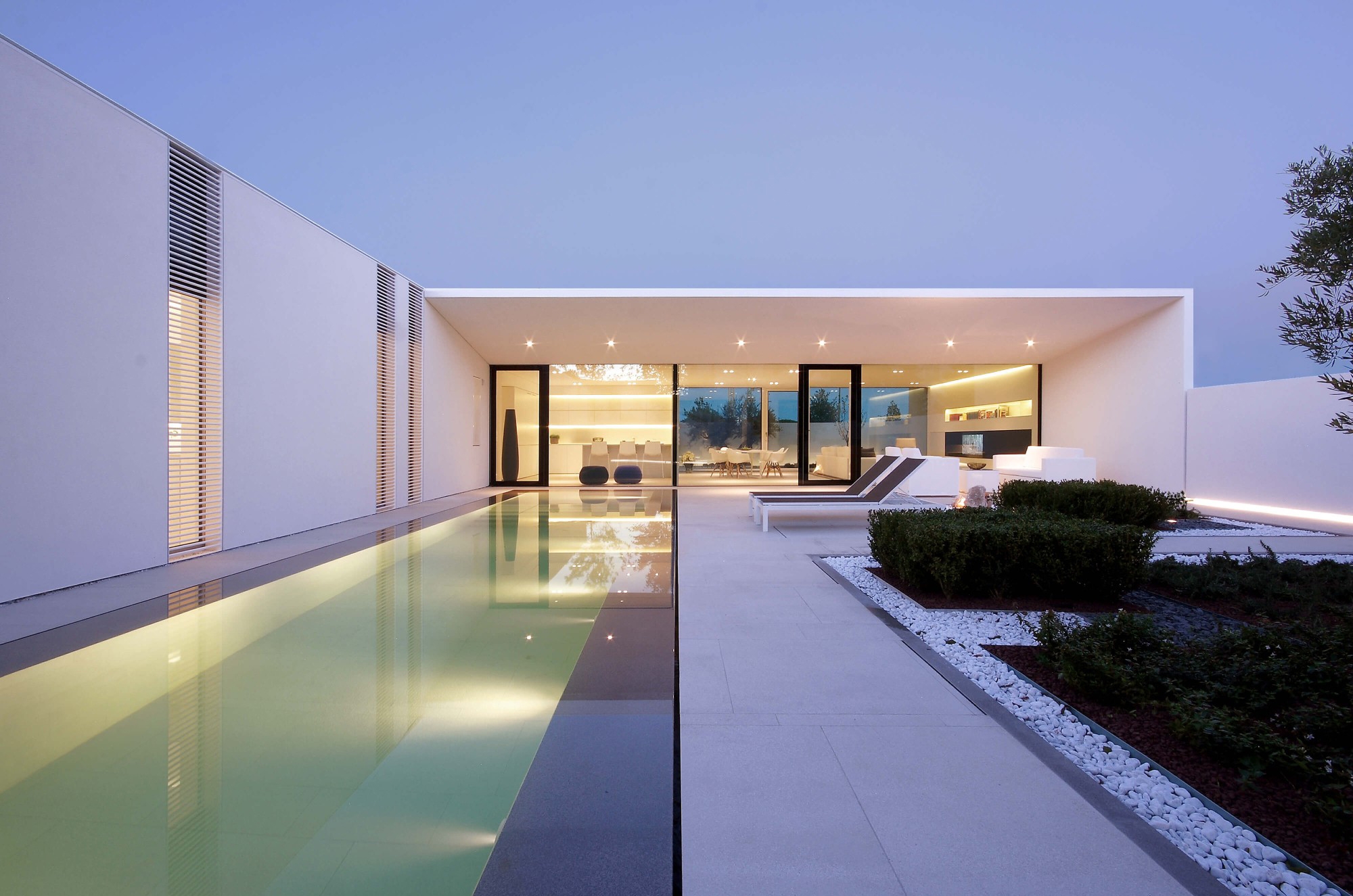 Oblikovanje: Zasebna hiša v beneškem obmorskem letovišču je rezultat drznega prostorskega načrta z bazenom in zunanjimi površinami, ki zahtevajo malo vzdrževanja, zgrajena na majhni parceli. Transparentni bivalni prostor se odpre na dve različno veliki dvorišči z oljčnim drevesom, ki ga opredeljuje. Štirimetrski strešni previs obrnjen na zahod daje senco v vročih poletjih. Tehnična oprema je bila večinoma integrirana v površine.